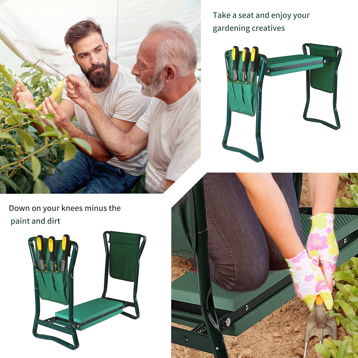 Repose Genoux de Jardin supporte jusqu'à 150kg Peut supporter jusqu'à 108 kg, notre siège de jardin portable est conçu pour résister à l'épreuve du temps, garantir une longue durée de vie et une efficacité... Coussin Genoux Rembourré Outils Taburete Pliable TomCare Repose-genoux De Jardin Amélioré Avec 2 Grandes Poches à Outils Banc De Jardinage Pour Genoux Repose-genoux Jardin Siège Description du produit Repose-genoux de jardin avec poignées, coussin à genoux en mousse souple 2 en 1 Avertissement De Sûreté [INF] Le poids maximum recommandé est de 108 kg, et il doit être nettoyé avec un chiffon sec pour garantir la sécurité. Peut supporter jusqu'à 108 kg, notre siège de jardin portable est conçu pour résister à l'épreuve du temps, garantir une longue durée de vie et une efficacité fonctionnelle. Wiltec Tabouret de jardinier 2 en 1 – 600 x 280 x 490 mm – Capacité 150 kg – en Fer et EVA – Agenouilloir de jardinage Pliable avec Poche, Assise rembourrée... Agenouilleur de jardin 2 en 1 : notre agenouilleur de jardin couvre tous vos besoins de jardinage : soulevez les jambes pour faire un banc confortable, ou posez-le à plat sur le sol pour un coussin à genoux de soutien. Utilisez-les pour ranger vos tondeuses, bêches, truelles, pulvérisateurs, et tout ce qui se trouve entre les deux, sécateurs à main, mais pratiques et hors de la route. Confort rembourré : le coussin ultra doux de haute qualité de ce repose-genoux de jardin réduit la pression douloureuse sur vos articulations, vous gardant à l'aise pendant de longues périodes. Facile à plier et à transporter : le mécanisme à ressort de haute qualité vous permet d'ouvrir et de fermer facilement ce repose-genoux, le repose-genoux peut être plié à plat en un clin d'œil, ce qui le rend encore plus pratique à transporter et à ranger, facile à ranger et à économiser de l'espace, peut être transporté facilement.