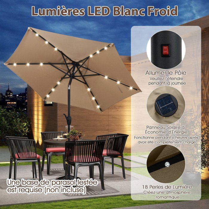 Sa housse est incluse et protège au mieux le dispositif lorsqu'il n'est pas utilisé. En plus d'être élégant, le parasol Kingsleeve est multifonction : le jour, il vous protège des rayons du soleil et recharge ses 24 LED ; la nuit, il vous procure une lumière chaleureuse ! 6 entretoises métalliques pour une grande stabilité Parasol de Jardin D.270CM-Parasol Patio Droit Inclinable 18 LED Solaire... Par ailleurs, le revêtement du parasol est hydrofuge. Diamètre du tube 38mm Aufun Parasol en Aluminium 350 cm avec LED Solaire avec Dispositif à Caractéristiques techniques : Diamètre : 270 cm Un puissant panneau solaire est installé directement sur le sommet du parasol et produit de l'électricité. Couleur au choix : Beige Matériel mât : aluminium Mât en 2 parties pour un rangement facile Le mât robuste en aluminium léger peut se séparer en deux parties et se ranger facilement. Il contient également un petit interrupteur marche/arrêt permettant de commander la lumière. Fini les efforts interminables et la perte de temps à chaque installation ! Couleur au choix : Anthracite Izrielar Parasol déporté inclinable 3.5m - Parasol - Parasol de jardin... Elle renforce ainsi la stabilité du dispositif et lui confère une grande résistance, même par mauvais temps. Le parasol est muni d'une toile 100% polyester d'un diamètre de 270 cm. Doté d'une manivelle pratique située sur le mât, ce parasol peut s'ouvrir et se fermer facilement et rapidement. Matériel revêtement : 100% Polyester , Nombre de LED : 24 Couleur au choix : Rouge Couleurs disponibles : beige, anthracite ou rouge En résumé : 24 lampes LED avec interrupteur marche/arrêt sur le mât du parasol , Panneau solaire puissant , Batterie incluse Un parasol en aluminium élégant et lumineux Protection solaire le jour et éclairage la nuit ! Protection UV 80+ Polyester KINGSLEEVE® Parasol De Jardin Extérieur LED Solaire 270cm Beige Pare Parasol Solaire Avec Lumière Ambiance GRANDE STABILITÉ : La cheminée de décompression offre une stabilité supplémentaire car elle permet à l'air de s'échapper vers le haut tout en empêchant l'accumulation de chaleur. De plus, le mât peut être démonté en 2 parties permettant un rangement facile. Le mât du parasol est constitué d'un tube en aluminium robuste et léger ainsi que de 6 entretoises métalliques lui conférant une grande stabilité.