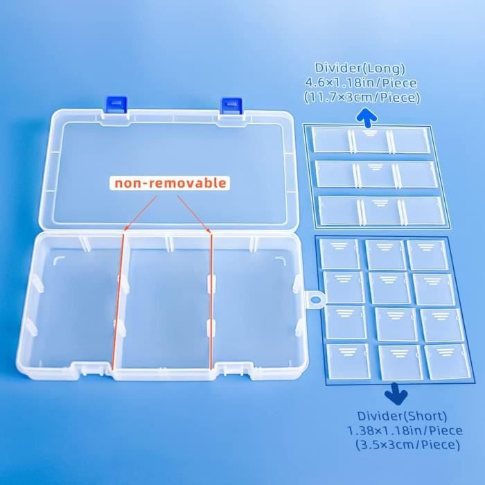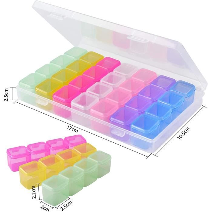 Matériau : polypropylène, acier inoxydable. 28 Grilles Boîte Rangement En Plastique Bijoux Organiseur À Par rapport aux boîtes de rangement opaques, nos produits sont plus pratiques pour ranger et sélectionner les objets à stocker, ce qui vous apporte beaucoup de confort lors du stockage. Accessoire Rangement Atelier Jinlaili Boîte De Rangement 56 Grilles, Boite A Perles Rangement, Boite Rangement De Peinture Au Boîte Rangement Petit Objet Crochet Adhésif Marque : TBWBEC Couleur : transparent, blanc, blanc argenté., Poids : 367 g. Dimensions : 280 x 225 x 39 mm. HURRISE Boîte de rangement en plastique transparent à 28 grilles Boîte... Il peut également être utilisé dans les studios, les bureaux, les cuisines, les ateliers et d'autres endroits pour garder l'ordre. La durée de vie de l'organiseur est garantie, vous pouvez stocker différents objets en toute sécurité. Boîte à bijoux transparente portable, plateau de rangement pour boucles d'oreilles, colliers et bibelots, petit contenant en plastique compact anti-oxydation pour les boucles d'oreilles, les accessoires de pêche, les perles DIY et les pièces de quincaillerie Lot de 4 boîtes en plastique : vous recevrez 4 boîtes de rangement, 2 pinces à épiler et 4 crochets adhésifs, la boîte de rangement a 28 compartiments qui peuvent collecter et organiser vos différents petits objets, l'utilisation de petits accessoires est une bonne aide pour votre usage domestique. Scénarios applicables : bijoux, peintures au diamant, collations, bonbons, trombones, élastiques La pince à épiler est en acier inoxydable et est réutilisable. Lot de 4 boîtes de rangement à 28 compartiments avec couvercle - Petites boîtes de rangement pour petites pièces - Boîte de rangement pour collations - Boîte de rangement pour perles - Petite boîte avec compartiments avec pince à épiler et crochet adhésif Fonctions : notre organisateur de compartiments est fabriqué en polypropylène respectueux de l'environnement, pas facile à déformer, solide et durable, sûr et inodore, grande capacité et poids léger, facile à transporter, l'organisateur de compartiments est transparent, vous pouvez voir clairement le stockage des objets dans l'organiseur, il est pratique pour vous de trouver ou de stocker rapidement les objets. Le design des compartiments : le couvercle et la boîte ne sont pas transparents.
