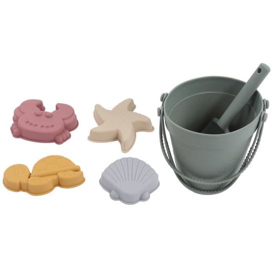 Cet ensemble de plage comprend un seau, une pelle et quatre moules à sable, le tout livré dans un filet de rangement en coton.