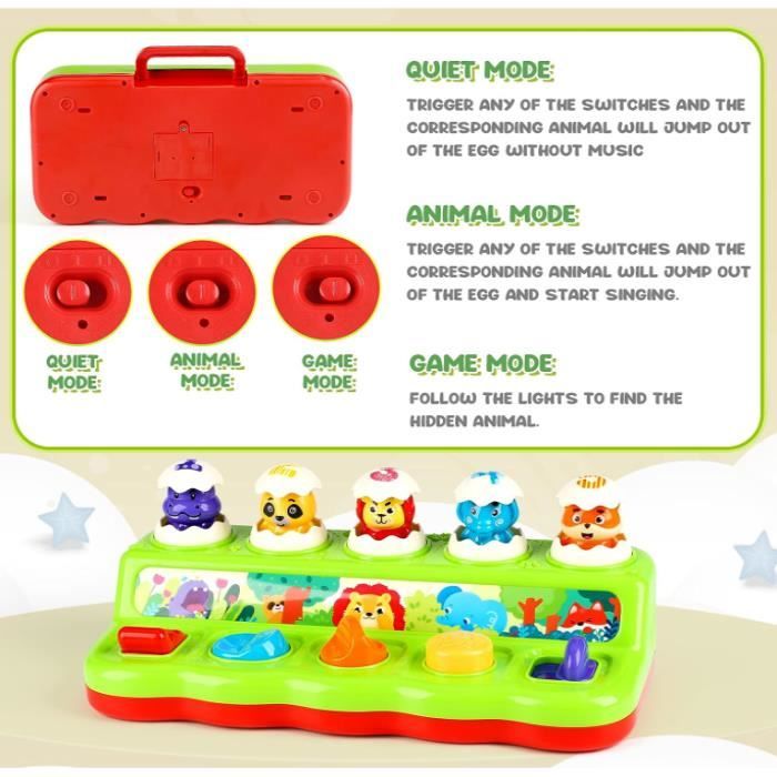 Jouet Coordination œil Main Jeu Pop Up Bounce And Catch, Jouet Interactif Sur Le Thème Des Animaux Avec 3 Modes Réglables Pour La Motricité Fine Et La - Jeux - Jouets Jeu éducatif Avec Filet De Capture Jeu d'éveil Pop Up- La ferme - Jeux et jouets Tolo - Avenue des Jeux Game Bounce Jeu de fête Jeu de société Adulte Jeu à boire Beer Off... Améliorez la motricité fine, la coordination œil-main et les capacités de jeu interactif des enfants avec ce jeu. MATÉRIAUX DE QUALITÉ SUPÉRIEURE : Fabriqué à partir de matériaux ABS de qualité, ce jouet pour enfants assure la sécurité avec des bords lisses, encourageant le jeu organisé et réduisant la perte de jouets. La fonction de rangement pratique favorise des habitudes de jeu bien rangées chez les enfants. JEU DE SOCIÉTÉ ENGAGANT : Notre jouet présente d'adorables personnages animaux, créant un design amusant et éducatif qui capte l'attention des enfants. 3 MODES RÉGLABLES : Cet appareil de jeu de société familial offre 3 paramètres différents, dont le contrôle de la musique et la force de rebond réglable, permettant un jeu personnalisable en fonction des préférences individuelles. JEU SIMPLE ET AMUSANT : Assemblez le gros animal au centre du plateau. Appuyez et placez les mini grenouilles dans les fentes, alignez-les avec les flèches, tournez l'interrupteur et commencez à faire tourner le cadran. JOUEZ AVEC LES ANIMAUX - Ce jouet pop-up émerveillera les bébés et les tout-petits de plus de 12 mois. Il comprend un marteau amusant avec 3 modes de jeu différents. Les adorables animaux colorés, tels qu'un hippopotame, un raton laveur, un lion, un éléphant et un renard, jouent de la musique joyeuse. Le volume est ajustable. Ce jouet amusant améliore la motricité fine et...