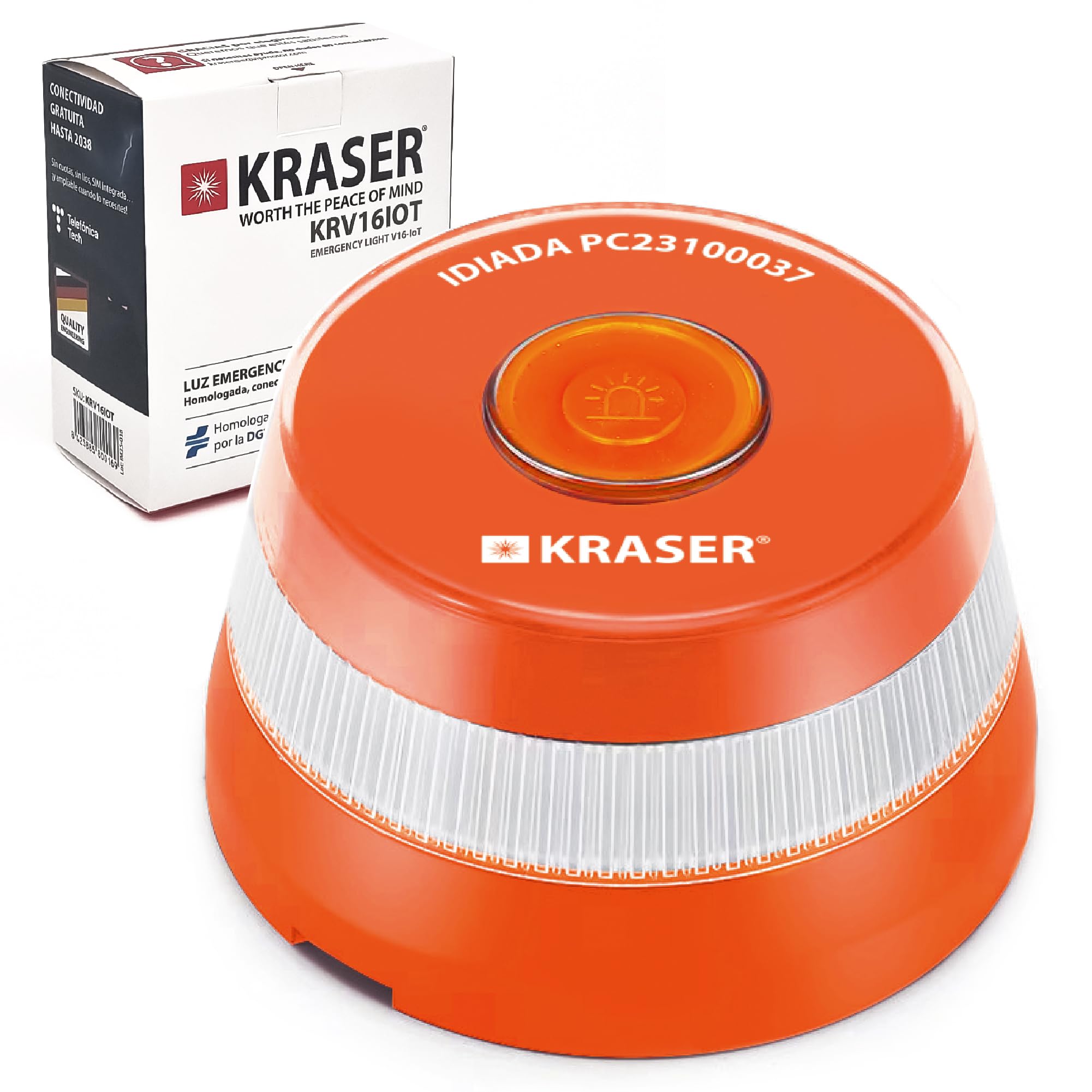 Elle inclut une carte SIM et des données mobiles payantes jusqu'en 2038., Après cette date, vous n'aurez plus rien à payer, sauf si vous prolongez volontairement le service. Il comprend une base magnétique, s'installe en quelques secondes sans quitter la voiture et fonctionne avec 3 piles AA incluses, prêtes à l'emploi. Prêt à l'emploi - Piles incluses : fonctionne avec 3 piles AA (incluses), faciles à remplacer n'importe où. Grâce à sa connexion automatique à la DGT 3., 0, elle transmet votre position en temps réel dès son activation, sans application ni inscription. Balise Voiture Gyrophare De Secours KRASER V16 - Balise Magnétique Son puissant éclairage LED à 360°, visible à 1 km, vous permet d'être visible par les autres conducteurs, même la nuit, par temps de pluie ou de brouillard. Vous êtes ainsi assuré d'acheter un produit 100 % légal et valide. La balise V16 homologuée DGT la plus visible et la plus sûre - Bien plus qu'homologuée : conçue pour que, le jour où vous en aurez vraiment besoin, elle soit totalement fiable, bénéficie de la meilleure couverture de Telefónica pour la géolocalisation avec la DGT et soit la plus visible même de jour grâce à sa couleur... Avec cette balise d'achat avec garantie réelle et support proche pour votre tranquillité d'esprit. La balise KRASER KRV16IOT est la balise V16 homologuée par la DGT (Direction générale de la circulation) et remplacera les triangles à partir de janvier 2026., Conforme à la réglementation officielle (RD 159/2021 et 1030/2022), elle a été certifiée par le laboratoire IDIADA sous le code PC23100037, publié sur le site web de la DGT. Homologué par la DGT – Obligatoire en 2026 : balise V16 officielle avec numéro d'homologation publié sur le site de la DGT (IDÉE PC23100037). KRASER KRV16IOT Balise V16 Homologuée DGT Plus Visible Et Balise V16 Espagne Il intègre un crochet pratique avec lequel vous pouvez accrocher la balise lumineuse à l'intérieur de la voiture, sur le guidon de la moto ou n'importe où... Autonomie suffisante pour les urgences et vérification rapide avant chaque voyage.