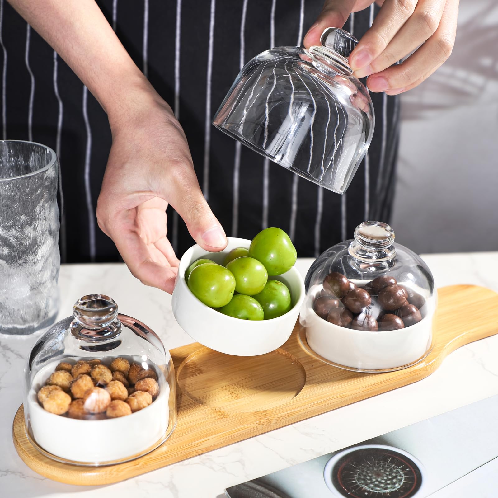 Kvmorze Ensaladera De Vidrio Con Base De Madera, Frutero Tra | Cuotas Plateau De Service En Bois, Plateau Rond Pour Collations Café Thé... Service Verre KVMORZE Ensemble De Service Pour Ites Et Trempettes Avec | WhichOne Set Collation Trempette Fromage Bonbons Passe au micro-ondes, four, congélateur et lave-vaisselle. Large application : cet ensemble de bols d'apéritif au design unique est parfait pour tout événement de service. Plateau de service en bois bambou, plateau de rangement de cuisine... Le plateau de service et les couvercles en bambou sont recommandés de laver à la main. C'est une jolie façon de présenter des apéritifs, des charcuteries, des condiments, etc. Rangement multifonction : ce pot pratique peut être utilisé pour stocker des ingrédients secs tels que la farine, le sucre, les assaisonnements, les épices, les graines et les céréales, les herbes, etc. ou comme une belle pièce maîtresse décorative sur votre table ou buffet.