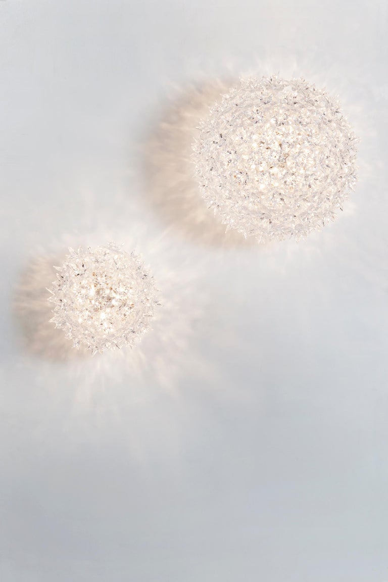Applique E' - Kartell Des ampoules placées à l'intérieur de la structure diffusent, à travers les pétales, le faisceau lumineux qui se réfléchit sur les surfaces facettées des fleurs en donnant naissant à mille reflets., Design : Ferruccio Laviani, 2011 IP20 ; 220 - 240 V ; G9 2700°K Lampe Bloom Design Kartell Bloom, Applique, Petit, Cristal à Partir De 324,00 LED G9 2700K Le résultat est une lampe produite industriellement mais avec les formes et la complexité stylistique d'une pièce unique, artisanale. La gamme de luminaires Bloom New de forme elliptique, qui se distingue par l'originalité de sa structure recouverte de scintillantes fleurs aussi pures et... Bloom de Kartell se compose d'un squelette tubulaire entièrement recouvert d'une structure formée de petites fleurs à double corolle en polycarbonate transparent. Bloom W: Lampe de plafond Kartell en technopolymère, en différentes