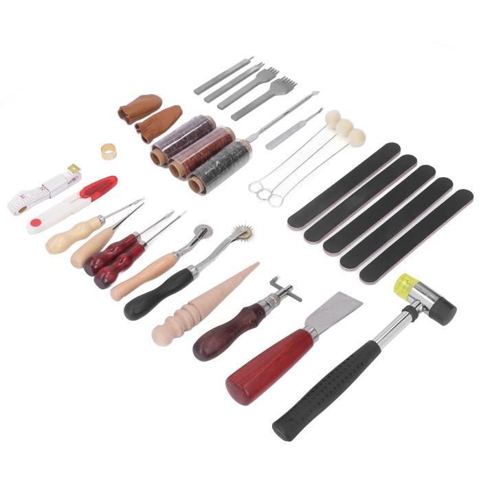 Kit Cuir Maroquinerie Kit D'outils Couture Du Cuir à La Main Starter Kit Maroquinerie Wamkon Kit d'outils pour le travail le repoussage la découpe le Lot de 40 outils de couture en cuir avec sac de rangement Cadeau parfait pour les amateurs de cuir Kit de couture en cuir pour débutants et professionnels. Cet... Kit de sculpture sur cuir : le pinceau en laine, le 20 outils d'embossage pour cuir, le couteau à cuir, l'outil de coupe de chanfreinage, les copieurs de bois, etc. inclus dans le kit d'outils d'artisanat du cuir, peuvent vous aider à terminer le projet de bricolage du cuir. Il est très facile à utiliser, et nous avons fourni le kit d'outils de travail du cuir avec des instructions pour vous référer (français non garanti). Ne vous inquiétez pas de la perte d'outils et il est facile à transporter. Vous pouvez utiliser ce kit d'outils de travail du cuir pour effectuer une gamme de processus tels que la coupe, l'estampage, la couture et la sculpture sur cuir. Avec ce kit d'artisanat en cuir, vous pouvez terminer la plupart des projets d'artisanat en cuir, ce qui est votre choix parfait. Cadeau parfait : notre kit d'outils pour l'artisanat du cuir comprend des outils de tampon pour l'artisanat du cuir et des outils de couture en cuir, qui peuvent être utilisés comme cadeau pour la famille ou les amis qui aiment l'artisanat du cuir. Vous pouvez utiliser ce kit d'outils de travail du cuir pour effectuer une série de processus tels que la coupe, l'estampage, la couture et la sculpture sur cuir