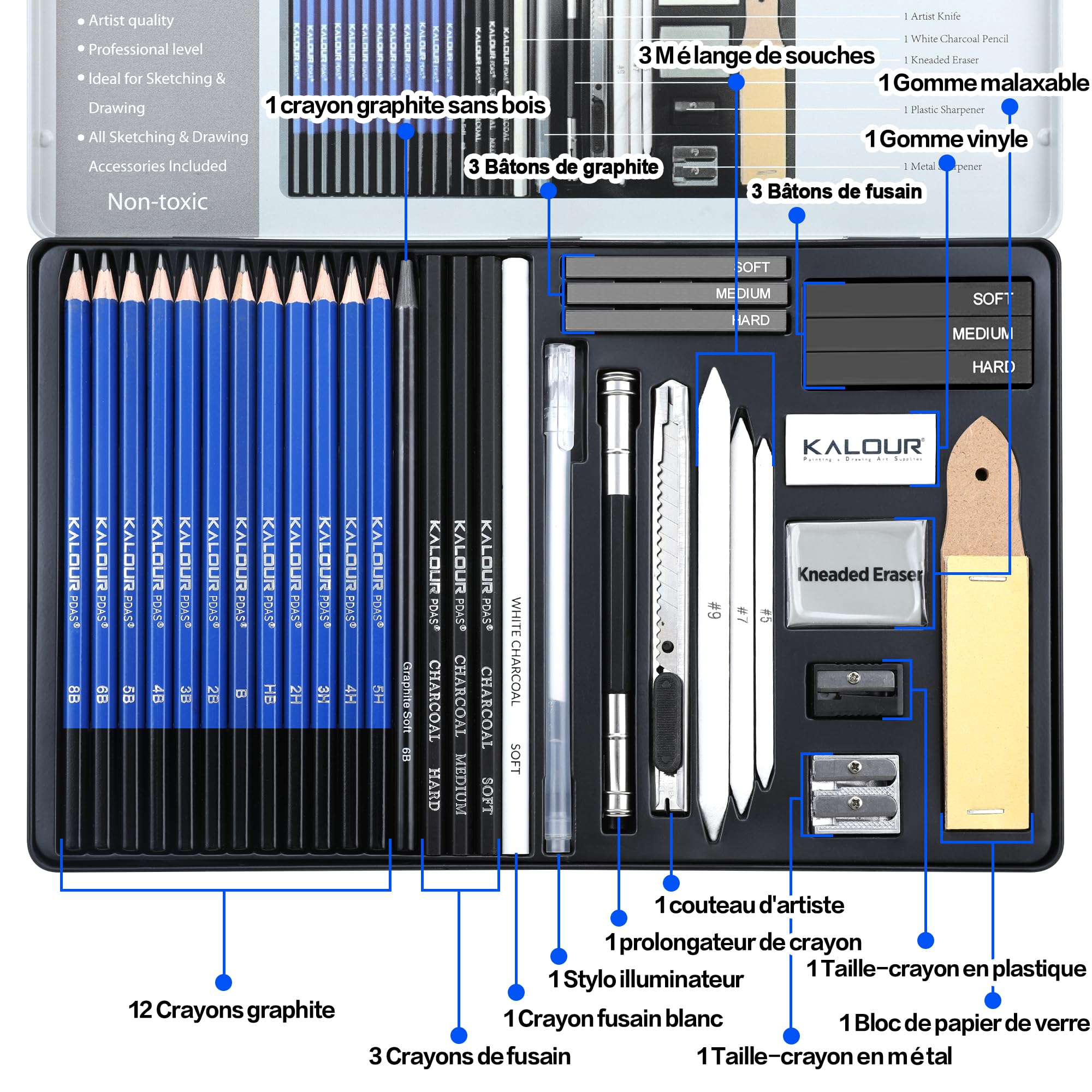 HIFORNY Lot de 100 accessoires de dessin et d'esquisse, fournitures Apprenez rapidement avec des crayons à croquis, des crayons à dessin graphite et des fournitures de charbon de bois. Fournitures Fusain Pastel KALOUR PDAS Kit De Dessin 112 Avec Carnet De Croquis 3 Couleurs Kit Dessin 112 Pièces KALOUR Kit d'art de qualité supérieure avec carnet de croquis 3 couleurs : carnet de croquis (15,2 x 22,9 cm, 100 g/m², 50 feuilles : 30 blanches, 10 beiges, 10 noires) prend en charge différents styles de dessin. HIFORNY Kit de 60 crayons à dessin - Fournitures artistiques avec... KALOUR Pro Crayons de Couleur, Enseble de 520 Couleurs, ine Douce... Idéal pour l'ombrage, les croquis, les ombres et les détails fins. Développez vos compétences en toute confiance et profitez d'une pratique de dessin sans stress. Un coffret cadeau polyvalent pour les artistes, les adultes, les adolescents et les débutants, parfait pour Noël, les anniversaires, l'obtention d'un diplôme ou les vacances. Comprend des gommes, des outils de mélange, des taille-crayons, du ruban adhésif et des accessoires, le tout emballé dans un seul kit. Crayons graphite professionnels et croquis : crayons graphite de haute qualité avec application lisse et mines incassables. 【Kit de fournitures artistiques professionnelles】 Kit de dessin complet de 112 pièces comprenant 24 crayons graphite (6H-14B), 3 crayons fusains noirs, 3 crayons de charbon blancs, 3 bâtons de charbon de bois compressé, 4 bâtons de charbon de bois de saule, 6 bâtons pastel de couleur, 1 crayon graphite sans bois, et plus encore.