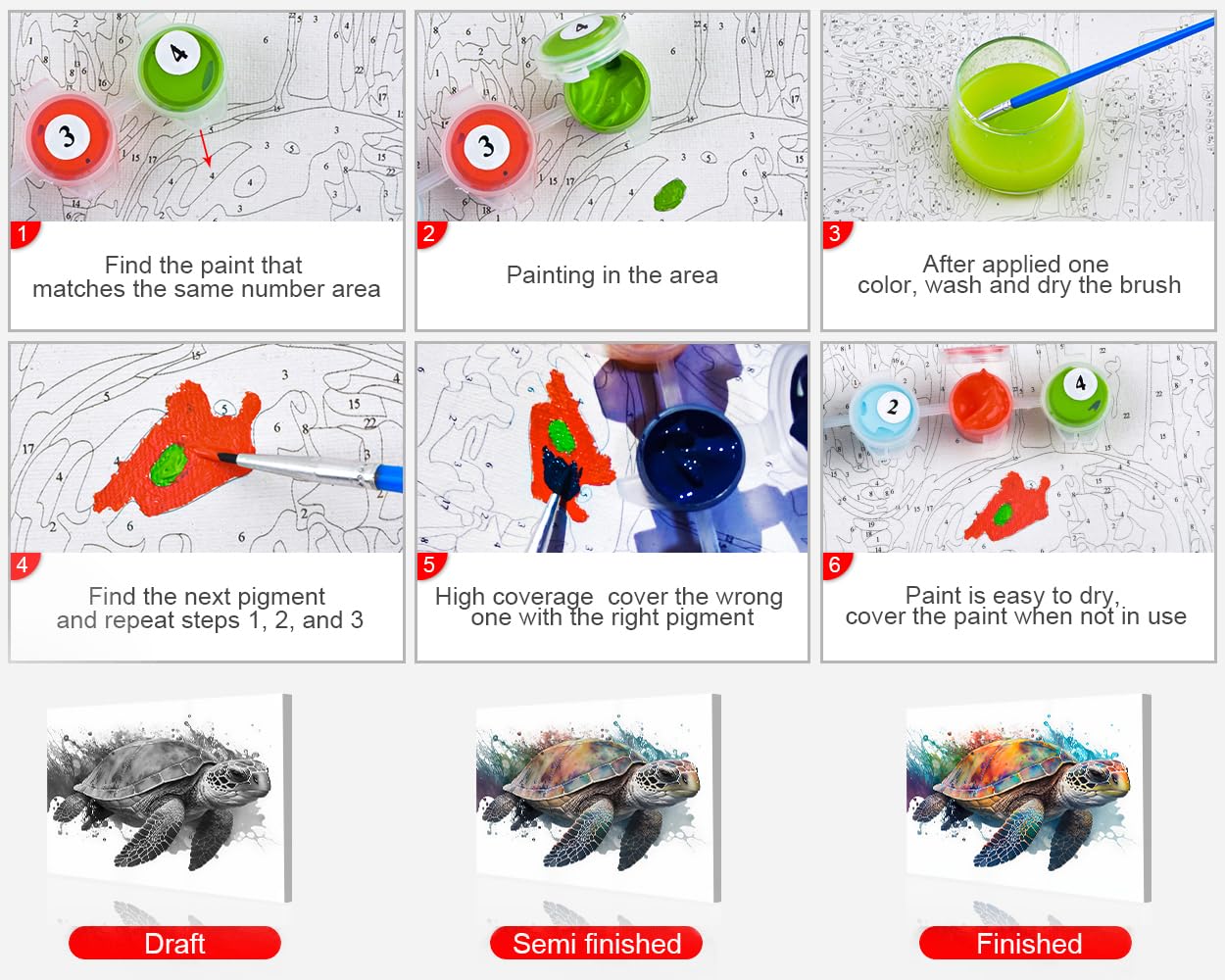 Appliquez simplement la peinture correspondante sur le numéro correspondant à la toile, ce qui est très adapté aux débutants Étape 1 : Dessiner le numéro sélectionné Étape 2 : Laver le pinceau Étape 3 : Colorier les autres zones de peinture Étape 4 : Afficher le tableau terminé par numéro Il fournit tous les outils dont vous avez besoin pour créer des œuvres d'art, vous aidant à vous détendre et à éliminer le stress de la vie quotidienne. Que vous partagiez de bonnes choses avec vos amis ou votre famille, une bonne peinture à l'huile représente votre attention Les kits KEYIFA sont conçus avec différents styles et thèmes pour répondre aux besoins de différents groupes d'âge Les kits KEYIFA sont conçus avec différents styles et thèmes pour répondre aux besoins de différents groupes d'âge Cadre de bricolage pour clouer la toile au... Cela vous permet de profiter du plaisir de peindre des créations artistiques ensemble De bonnes choses à partager KEYIFA Peinture par numéros Kit complet, plaisir garanti : avec KEYIFA, la peinture à l'huile devient un jeu d'enfant Sand Painting Kit De Peinture Par Numéros Pour Adultes, Tortue De Mer Dans La Mer Avec Pinceaux Et Pigments Pour Décoration Murale De La Maison, Loisirs Créatifs, 40,6 X 50,8 Cm Pinceau Peinture Numero La peinture au numéro est une manière unique de réaliser des œuvres d'art à partir de kits prêts à peindre. Il vous suffit de sélectionner votre design, la taille et le type de châssis. On l'appelle aussi DIY peinture par numéros car ce loisir créatif pour adulte consiste à peindre par soi-même des tableaux en peinture acrylique. Avec plus de 2000 designs disponibles, nous... L'association des couleurs nécessite de la concentration, et cette expérience en douceur peut soulager efficacement l'anxiété Le fort pouvoir couvrant du pigment vous permet de superposer les couleurs existantes sans perdre leur vivacité Matériaux spécialement conçus : les pigments spécialement conçus ont une saturation des couleurs et une durabilité élevées. Décoration d'intérieur tendance : l'œuvre finie peut être accrochée, ajoutant une touche personnalisée à votre salon, chambre ou bureau. Numéro De Maison KEYIFA Peinture Par Numéros Adulte - Arbre De Vie Soulagement du stress : S'immerger dans le processus de peinture peut vous aider à vous débarrasser du stress de la vie quotidienne. Les œuvres finies peuvent être placées dans le salon, etc. ajoutant une atmosphère artistique et de la beauté à l'environnement domestique En nous concentrant sur la peinture à l'huile, nous pouvons oublier temporairement les soucis et les pressions du monde extérieur
