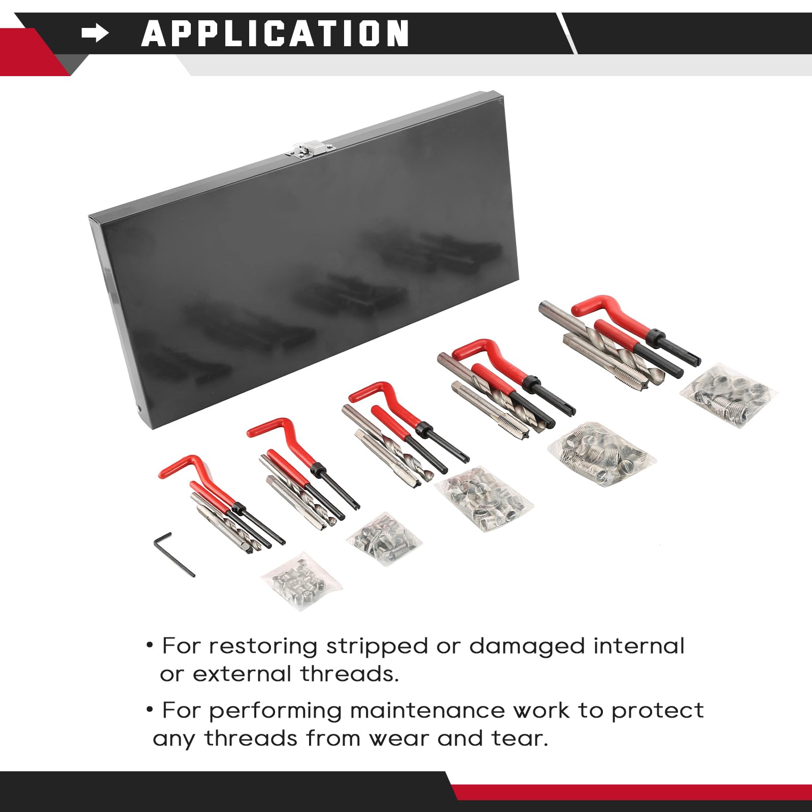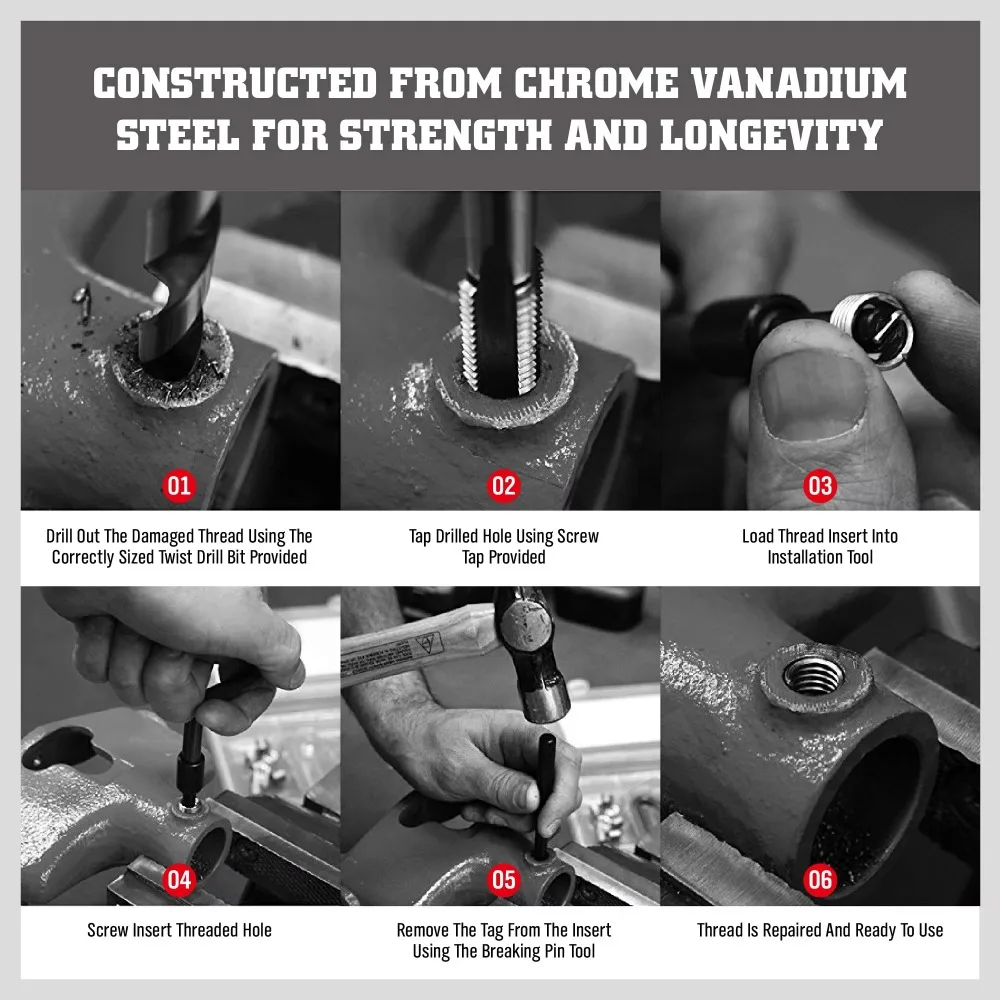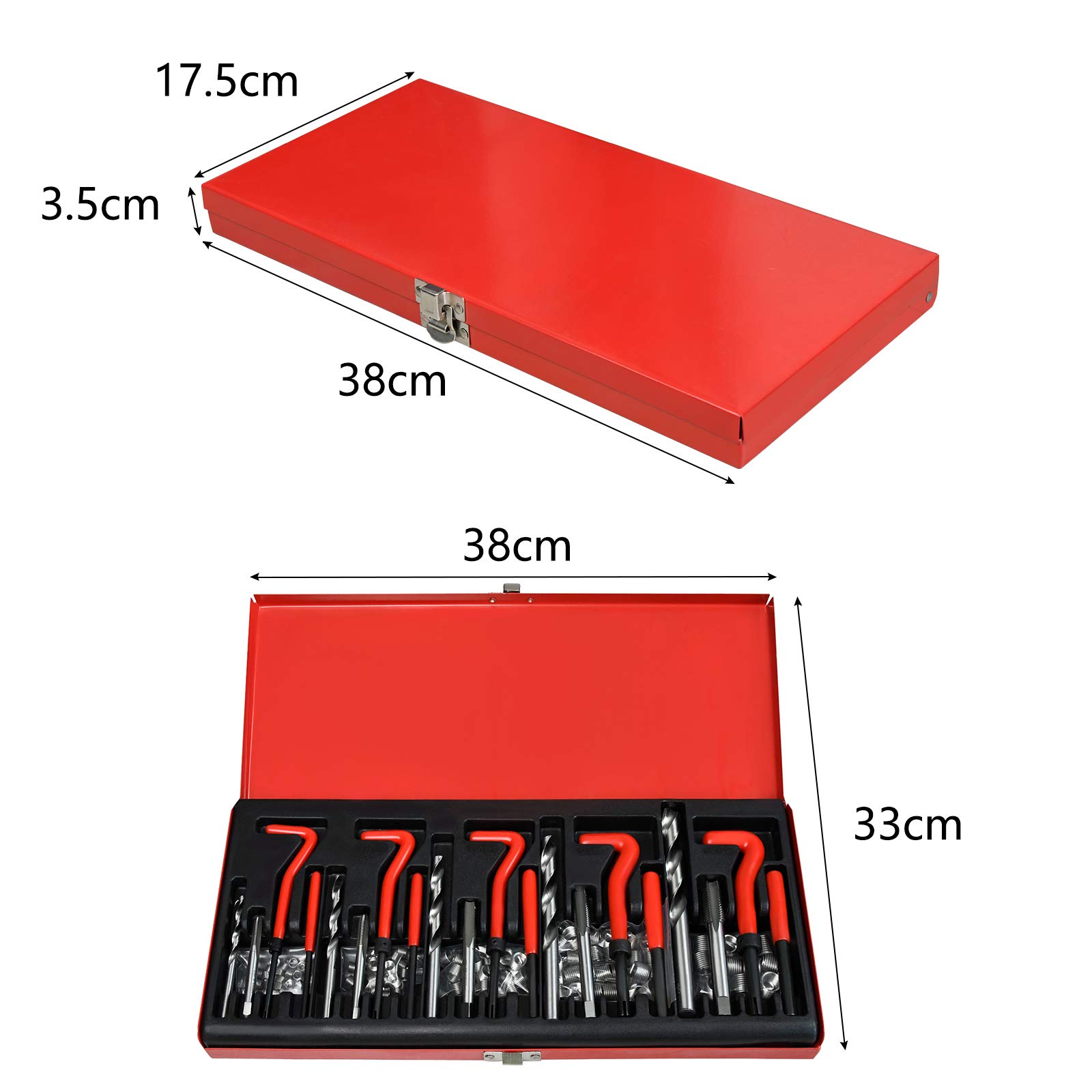 Dapetz® 131 PC Helicoil Filetage Re-Filetage Kit Réparation M5 M6 M8 M10 M12 Métrique Twist Bits Mega Set Il vous suffit d’insérer l’insert approprié dans le filetage défectueux et de le fixer à l’aide des outils inclus. Ce kit helicoil est conçu pour vous offrir une réparation de filetage efficace et sans tracas Insert Filetage M5 M6 M8 DAYUAN Helicoil Kit De Réparation De Filetage Métrique 131 Pièces Kit M5 M6 M8 M10 M12 Polyvalent et Fiable : Ce kit réparation filetage helicoil est idéal pour la réparation des filetages défectueux dans les moteurs, les voitures, mais aussi dans d’autres domaines comme l’industrie, la plomberie ou les équipements mécaniques, offrant ainsi une solution complète et fiable. Stockage Pratique et Organisé : Le kit de réparation est soigneusement rangé dans une boîte métallique robuste, facilitant ainsi son rangement, sa protection et son transport. Il permet de réparer facilement les filetages internes endommagés ou arrachés. Le set comprend des inserts filetés (helicoils) en 5 tailles : M5, M6, M8, M10... Ce kit réparation filetage helicoil assure des réparations sûres et de qualité, évitant tout dommage supplémentaire aux pièces environnantes. Facilité d’Utilisation : L’utilisation de ce kit réparation filetage est simple et rapide. Ce kit helicoil est conçu pour vous offrir une réparation de filetage efficace et sans tracas. Il vous suffit d’insérer l’insert approprié dans le filetage défectueux et de le fixer à l’aide des outils inclus.