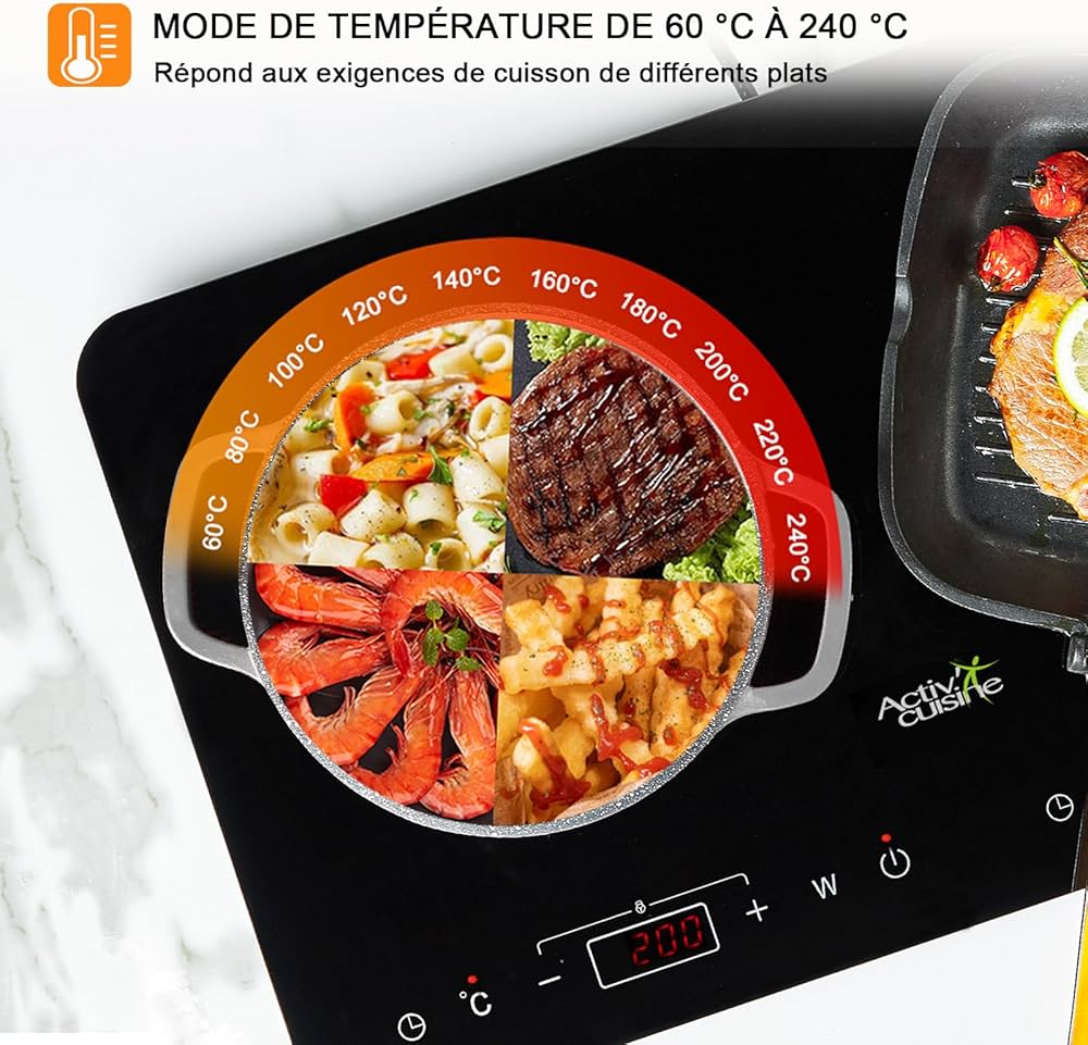 Plaque Induction 4 Feux Klarstein Kochheld Plaque De Cuisson à Induction Double 6000W Réglage Cuisinière Mobile Camping Caso S-Line 3500 Table de cuisson mobile à double induction SUBZONAL-CASO Touch 3500 Plaque de cuisson à induction double mobile, Interrupteur de sécurité, 60-240°C, 6 niveaux, Minuterie 180 min, Casseroles jusqu'à 26 cm, 3500 Watt, Vitrocéramique au meilleur prix - Comparez et achetez SUBZONAL-CASO Touch 3500 Plaque de cuisson à induction double mobile, Interrupteur de sécurité, 60-240°C, 6... 🔥 RAPIDE & ÉCONOMIQUE - 3500 W chauffent les plaques de cuisson à la vitesse de l'éclair, qui peuvent être réglées indépendamment les unes des autres. La transmission directe de l'énergie à la casserole permet de cuisiner en économisant de l'énergie. 🔥 POUR CUISSONS & POÊLES - Les ustensiles de cuisine compatibles avec l'induction d'un diamètre de 12 à 24 cm peuvent être utilisés sur la plaque de cuisson à induction. Flexible, intelligent et mobile sans limite : les plaques à induction CASO Design allient technologie et design innovants pour conquérir votre cuisine. 🔥 MULTIFONCTIONNELLE - En plus d'une fonction minuterie jusqu'à 180 min, la double plaque à induction possède 6 niveaux de puissance et 10 niveaux de température avec une présélection de température d'environ 60 à 240° C. 🔥 UTILISATION SÛRE - La plaque à induction possède une détection automatique des casseroles, une protection contre la surchauffe et un arrêt automatique. De plus, une sécurité enfants est mise en place. Découvrez la plaque de cuisson à induction Touch 3500 avec surface vitrocéramique de haute qualité. Puissance de 3500 watts 10 niveaux de température et 6 niveaux de puissance. Fonction de minuterie de 1 à 180 minutes et détection automatique des pots pour une cuisson facile et rapide. Design moderne et pratique