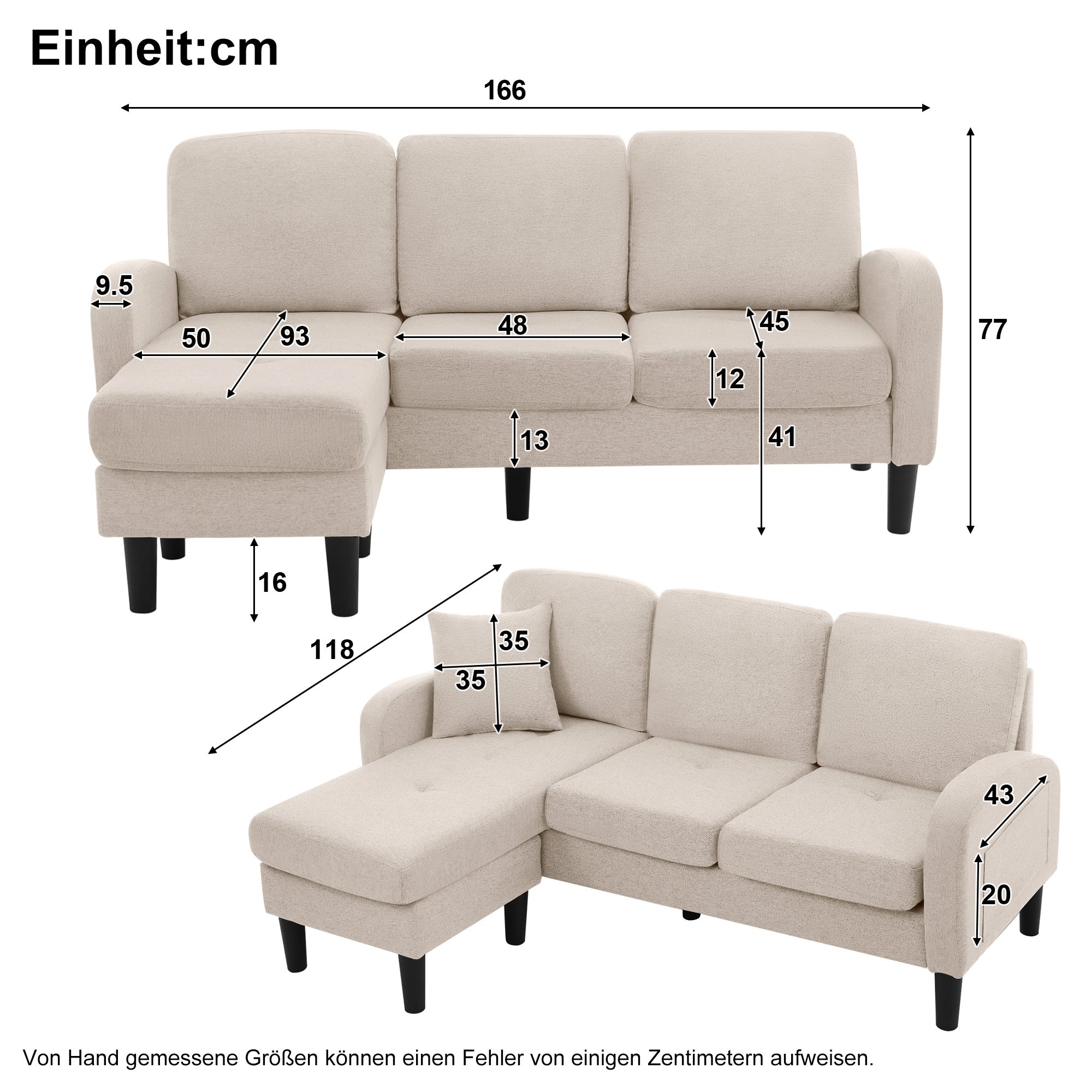 Canapé D'angle Salon Petit Espace Canapé D'angle En L 166x118x 77 Cm - OKWISH - Canapé 3 Places Avec Housse Chaise Canapé d'angle droit 4 places en velours côtelé grosses côtes Ela Canapé d'angle, 185 x 118 x 82 cm, Protection Respirante, avec Lavable... 【Assise moelleuse et confortable 】Garni de coussins épais et souples, ce canapé offre un excellent maintien et un confort immédiat. Idéal pour s’asseoir, se prélasser ou même s’allonger après une longue journée. 【Dimensions compactes 】Grâce à son encombrement maîtrisé, ce canapé convient idéalement aux pièces exiguës tout en accueillant confortablement jusqu’à 3 personnes. Détails du produit: Dimensions du canapé : 166 × 118 × 77 cm (les dimensions mesurées à la main peuvent varier légèrement) Poids net : 36,8 kg Poids brut : 40,3 kg Nombre de colis : 2 (peuvent ne pas arriver le même jour) Matériau : tissu : Foam Capacité de charge maximale : 90 kg Outils supplémentaires requis : oui 【Tissu en coton-lin】Le revêtement en mélange coton-lin assure une excellente circulation de l’air. 【Structure solide et pieds renforcés】Doté d’un cadre robuste et de pieds en plastique résistant, ce canapé allie solidité et protection du sol. Conçu pour résister à l’usage quotidien, il s’impose comme un meuble fiable et durable. Structure solide et pieds renforcés]Doté d’un cadre robuste et de pieds en plastique résistant, ce canapé allie solidité et protection du sol. Conçu pour résister à l’usage quotidien, il s’impose comme un meuble fiable et durable