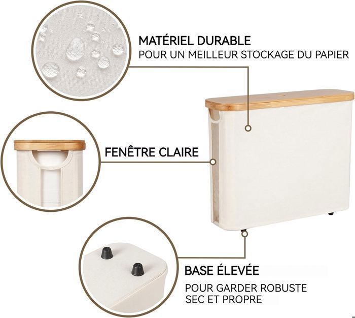 N'hésitez pas à le déplacer et à le placer sans effort où vous le souhaitez. Avantages et Fonctionnalités du Produit 1., Le design élégant de la couverture en bambou ajoute une touche tendance et garantit que le papier toilette reste propre et bien rangé., 2., Conception de poignée creuse, manipulation facile et fluide., 3., Base antidérapante, plus stable et fiable., 4., Le tissu Oxford a certaines propriétés imperméables et garde les serviettes en papier au sec. Organisation Salle De Bain Imperméable Panier De Rangement Pour Papier Toilette 23,6 L Avec Couvercle, Capacité, 45 X 15 X 35 Cm, Organisateur De Salle De Bain (Noir Boîte Rangement Papier Toilette Panier de Rangement pour Papier Toilette Furpaw en Tissu avec Couvercle en Bambou - Grande Capacité, Pliable et Résistant ... -15€ dès 129€ d'achat, code 15DES129... 【Fenêtre transparente sur le côté et design antidérapant au bas】: La fenêtre transparente sur le côté permet de surveiller facilement le nombre de rouleaux de papier toilette restants, évitant ainsi toute situation embarrassante due à un manque de papier. Description du produit Panier à Papier Hygiénique avec Couvercle En utilisant nos armoires de rangement pour papier toilette, vous pouvez organiser vos essentiels de salle de bain et garder tout propre et facile d'accès. Grâce à ces étapes simples, le produit sera prêt à l'emploi en un rien de temps. Le rangement pour papier toilette de la salle de bains est également parfait pour organiser les jouets, les serviettes, le linge sale et les objets essentiels de la salle de bains. 【Panier de rangement de grande capacité】: Ce porte-papier hygiénique mesure 45 cm x 15 cm x 35 cm et peut contenir jusqu'à 12 rouleaux de papier hygiénique, garantissant que vos essentiels sont toujours organisés et à portée de main. Dites adieu au désordre et profitez d'une salle de bain organisée. Assemblez rapidement et sans effort notre porte-papier hygiénique en suivant les étapes d'installation fournies dans l'emballage. Il y a des trous des deux côtés pour faciliter et assurer un transport en douceur. Le panier de rangement est disponible en noir, blanc et gris, selon votre style d'intérieur. 3 couleurs au choix. Des plis peuvent apparaître après l'installation, ils peuvent être repassés ou disparaître après deux ou trois jours d'utilisation Dites adieu au désordre et profitez d'une salle de bains bien organisée. Lorsqu'il n'est pas utilisé, il se replie pour un rangement compact. Grande Capacité Avec une capacité de 30 litres, il peut contenir jusqu'à 12 rouleaux de papier toilette. Panier De Rangement Pour Papier Hygiénique Avec Couvercle Boite De Rangement Multifonctionnelle Pour Maison Support De Rangement Pliable Noir 96703372
