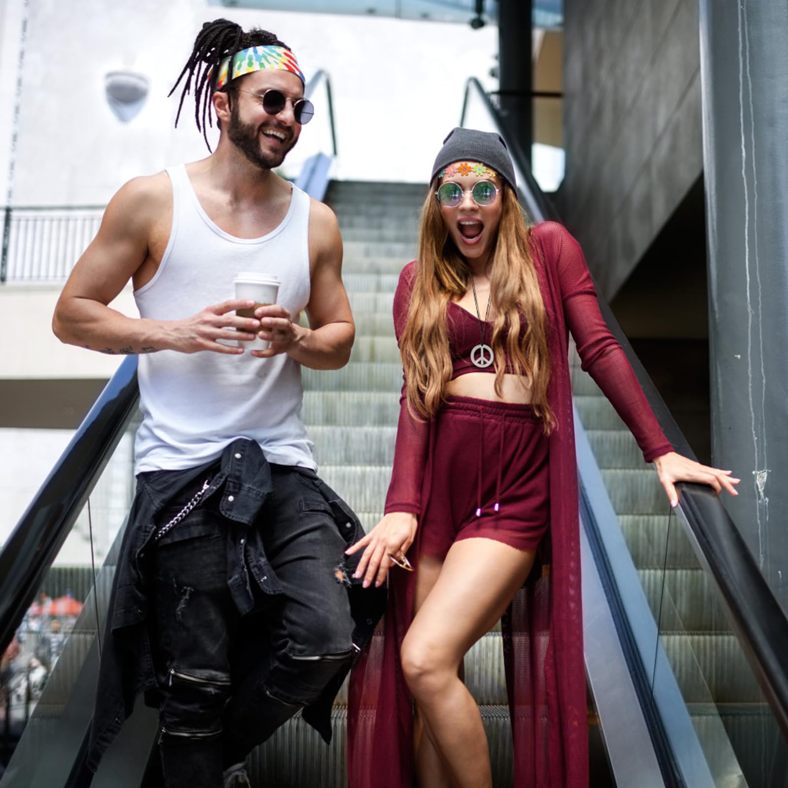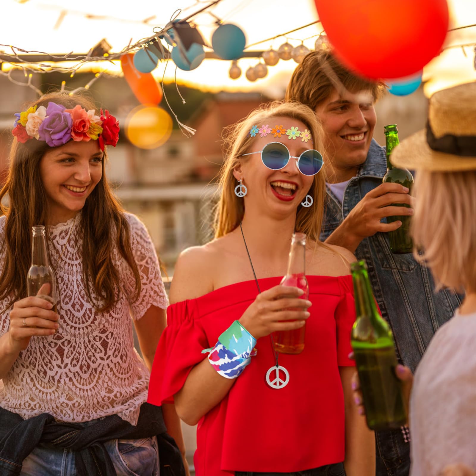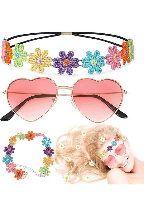 Motif Groovy De Fleurs De Marguerite. Fond Hippie Floral Rétro Avec Des Fleurs Et Des Symboles... Bandeaux marguerite: 58~66cm; Bandeaux marron: 50~65cm. 🌸Parfait pour: Costume vintage 60 70 ans, pour boîte de nuit, mascarade pour carnaval, fête entre amis, soirée dansante et soirée à thème EVJF, carnaval, Halloween, c'est aussi un cadeau pour les adultes qui aiment le cosplay. Bandeaux Fleurs Marguerite LAMEK 6Pcs Accessoires Hippie Deguisement Kit Ensemble Costume Hippie Lunettes Rondes Hippie Collier Paix Bandeaux Marguerite Serre Tête Coloré Rétro Année 80 🌸Les Bandeaux: Ils sont en coton, dans un style vintage et rétro, avec élastique réglable, agréable à porter. Costume Hoppie: 2 Bandeau vintage 2 Colliers de paix 2 Paires de lunettes rétro. 🌸Lunettes rétro: Elles sont en plastique, de forme ronde, avec des verres roses et marron, très belles et modernes 🌸Costume Hoppie: 2 Bandeau vintage + 2 Colliers de paix + 2 Paires de lunettes rétro. CLDURHGE 6 Pièces Enfant Fille Floral Serre-tête, Bandeau Couvert de Fleurs de Marguerite pour