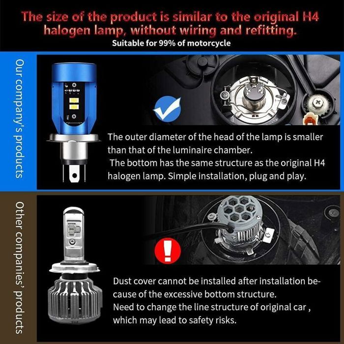 Suparee 2 Pièces 7 Pouces 50w Phare Led Lumière Courante Avec Yeux D Remplacement parfait de OEM H4 ampoule H4 Led Voiture Ampoule H4 LED Avec Yeux D'ange, Phare HS1 6400LM DC 12V Pour Moto Bleu Pack De 1 98498105 éclairage Moto Blanc Puissant 【H4 LED avec Yeux Ange】Ampoule H4 LED moto avec des yeux bleus Angel a une forte pénétration dans les intempéries, une plus grande vigilance face à la circulation et une sécurité de conduite accrue. H4 LED avec Yeux Ange]Ampoule H4 LED moto avec des yeux bleus Angel a une forte pénétration dans les intempéries, une plus grande vigilance face à la circulation et une sécurité de conduite accrue Ampoule H4 LED avec Yeux D'ange, HS1 Phare per Moto 6400LM, DC 12V... 【Garantie de Qualité 】IP68 imperméable à l'eau, EMC prêt pas de scintillement et problème d'erreur. 【Système Refroidissement Intégré】Ventilateur silencieux turbo et le corps de lampe en aluminium d'aviation peuvent rapidement dissiper la chaleur produite par les puces LED, font la LED pour fonctionner dans des conditions sûres et stables de température tout en augmentant sa durée de vie plus de 40., 000 heures Si vous avez des questions/problèmes au sujet des phares de moto H4 LED, n'hésitez pas à poser une question ci-dessous ou contactez nous Avant l’achat, vous devez mesurer la profondeur (59mm) et la largeur (35mm) de votre phare d’origine pour s’assurer qu’il ya assez d’espace pour installer l’ampoule. Compatible avec la plupart des motos DC 12V. Spécification: Modèle LED :H4/HS1 Tension: DC 12V Puissance: 30 W Max Lumen:6400LM Température de couleur : 6000K Durée de vie : environ 40 000h Niveau imperméable à l’eau:IP68 Température de travail : -40 'C '150 'C conditions compliquées Type LED : CSP super luminosité Note Importante: SUPAREE Led ampoule directement installer dans le boîtier des phares et des prises d’usine, il n’y a donc pas de tracas sur l’installation ou la modification.