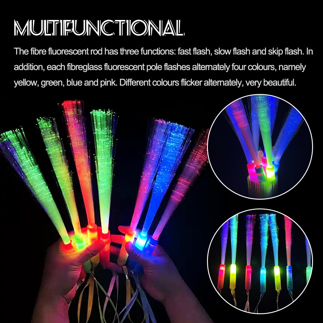 【Conception portable】Les bâtons lumineux mesurent environ 35 centimètres de long, sont petits et portables et peuvent être transportés partout. Décoration Nocturne Colorée Kangtaixin Bâtons Luineux LED En Fibre Optique - Lot De 12 Avec Piles, Pour Adultes Et Enfants Bâtons Lumineux LED Caractéristiques: 1., Ce jouet lumineux coloré peut être réglé sur trois modes différents. Le lot de 45 bâtons lumineux colorés garantit une ambiance festive lors des anniversaires d'enfants, des festivals et autres événements. Il suffit d'appuyer sur un bouton pour que les lumières s'allument et offrent trois modes d'éclairage : clignotement rapide, clignotement lent et lumière continue 【Fonctionne à piles】Les bâtons lumineux sont équipés de 3 piles boutons AG13 intégrées. Il suffit de retirer la feuille plastique isolante située au bas de la barre lumineuse pour que celle-ci s'allume. bâtons lumineux fibre optique à led -ce magnifique plumeau lumineux illuminera et vous assurera... pour créer une ambiance joyeuse et romantique. Le clignotement rapide, le clignotement lent et la lumière constante peuvent être facilement réglés à l'aide des boutons du contrôleur., 2., Grâce à ses piles intégrées, il est immédiatement prêt à l'emploi et agite les bâtons lumineux dans l'obscurité avec une lumière vive et brillante pour une fête amusante pour les enfants et les adultes., 3., Il y a 15 bâtons en fibre de verre en quantité suffisante pour répondre à vos besoins en matière de décoration ou d'utilisation quotidienne. Lorsque les piles sont vides, il suffit de les remplacer. Résultats pour Bâtons Lumineux en Fibre LED Clignotants 【Kit de bâtons lumineux LED en fibre optique】Le kit comprend 15 bâtons lumineux LED en fibre optique avec des poignées de 4 couleurs différentes : rose, vert, bleu et jaune. 【Matériaux de haute qualité】Les bâtons lumineux sont fabriqués en PS et en fibre de verre de haute qualité.