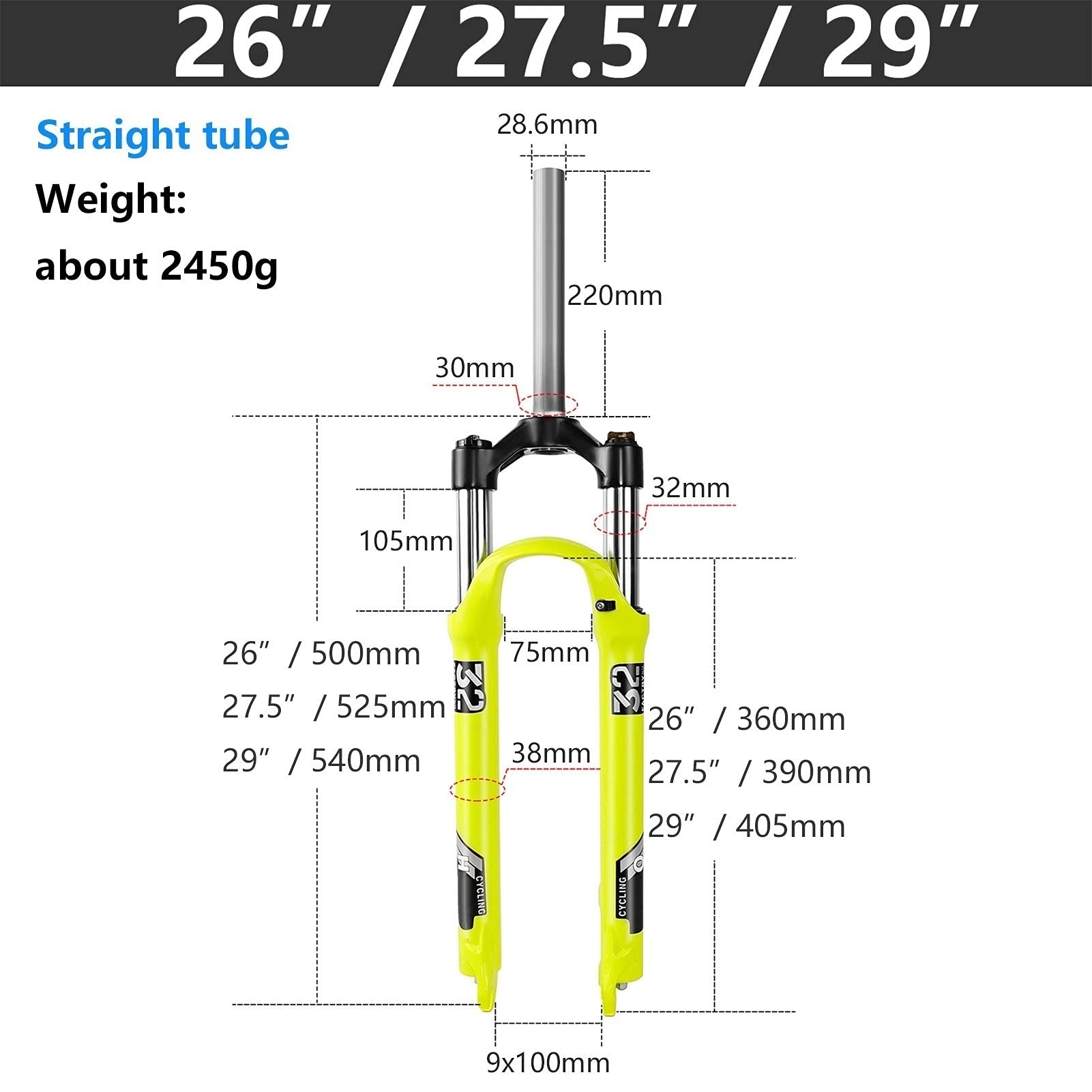 Fourche Conique 1-1/8 Fourche Suspension VTT 27,5 AADDFDD - 120mm De Débattement, Axe 15x100mm Fourche 27.5 120mm VTT BICYCLE-SUSPENSION FOURCHE Poussière Fermé Huile Fermé for Sr... Fourche Pour Vtt LHHL VTT Fourche Vélo 27,5" 29" Amortisseur Air DH Suspension En Descente Verrouillage Manuel Réglage Du Rebond Pivot Droit 1-1/8" 2350g (Color : Gold, Size : 27.5in Axe QR 100x9mm pour pneus de 2,4 poucesChamp d'application : VTT, DH, AM, XC, Trail, tout-terrain, etc. Service : en cas de problème avec un produit ou un service, veuillez nous contacter et nous vous répondrons dans les 24 heures. Fourche de suspension VTT 29 pouces YOSOO en aluminium léger avec... Poids approximatif : 27,5 pouces 2550 g, 29 pouces 2600 gContenu : 1 fourche à suspension VTTRemarque : veuillez vérifier la largeur du moyeu de votre paire de roues avant l'achat pour voir s'il convient. Fourche à suspension avant mécanique VTT mono-épaule, amortisseur à ressort, verrouillage manuel. MATÉRIAU : Alliage d'aluminium ultraléger de haute qualité, solide et durable CONVIENT POUR : VTT, DH AM XC Trail, vélo tout-terrain, etc.