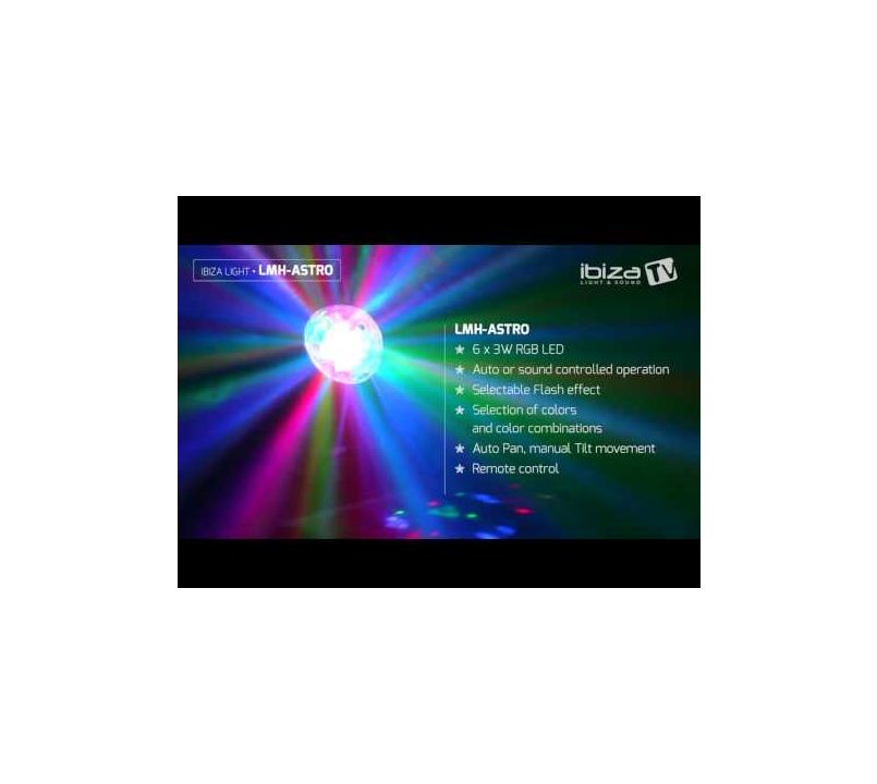 IBIZA LIGHT LMH-ASTRO Lyre à LED rvb avec effet astro KK22... pan: automatique / tilt: manuel modes: auto et musical Tête Mobile Lumière Fête IBIZA LIGHT LMH-ASTRO 016570 CABEZA MOVIL DE LED RGB CON EFECTO ASTRO | Audiovision Effet Lumière Danse Clause de non-garantie ✔️ Votre spécialiste son, lumière et karaoké depuis 1984 ✔️ Joignable au 03-44-02-72-88 ✔️ Nos produits sont neufs, garantis 2 ans, livrés avec une notice en Français ✔️ Livraison rapide et soignée., effet astro à 360° La lyre IBIZA LMH-ASTRO est l'accessoire incontournable pour créer une atmosphère festive et dynamique. Dotée de 6 LED RVB de 3W, cette lyre compacte projette des effets lumineux multicolores qui animent l'espace et captivent l'attention La tête peut être inclinée selon vos besoins pour projeter les rayons sur le plafond, les murs et le sol. Jeu de lumières IBIZA LMH-ASTRO
