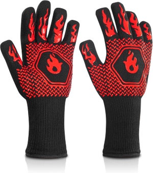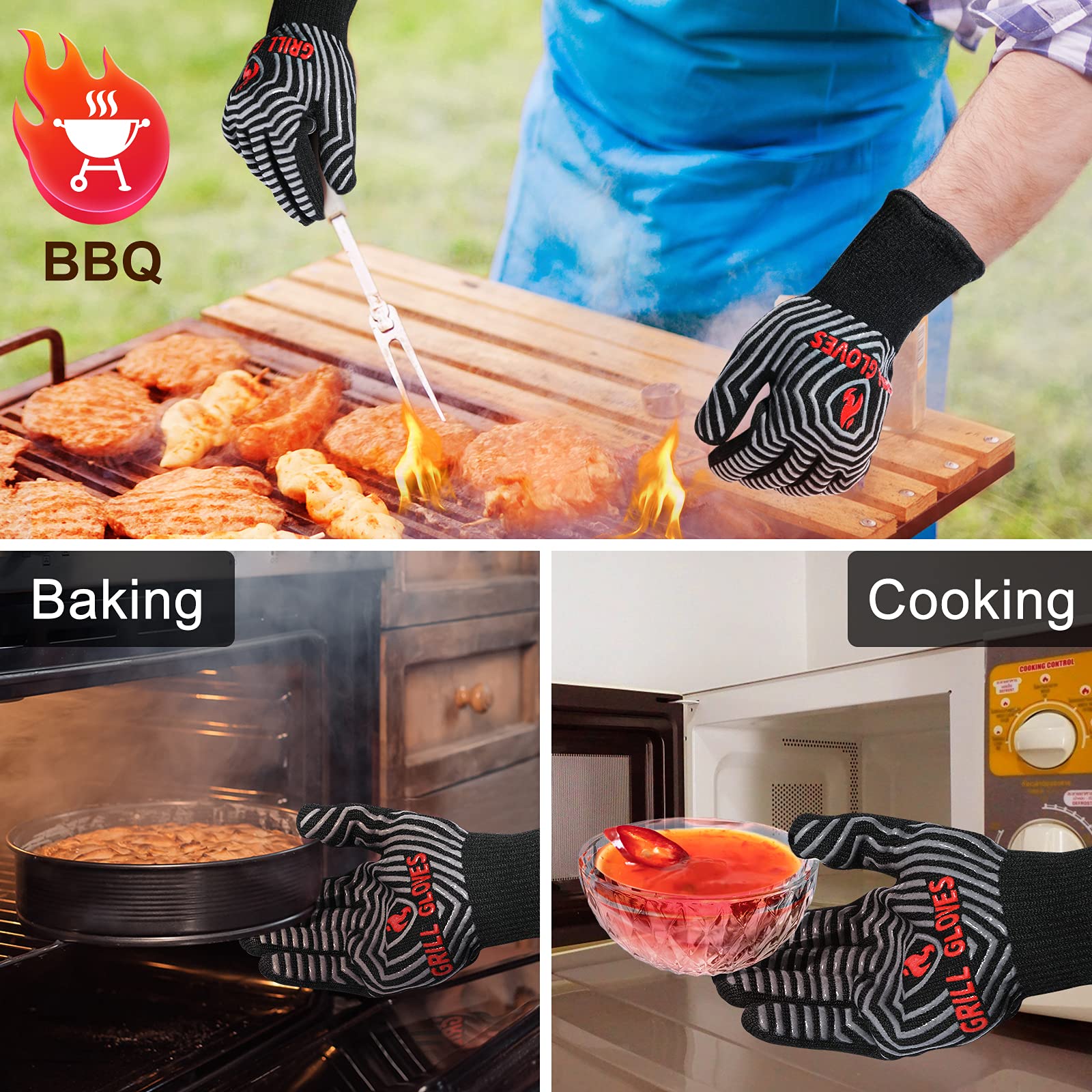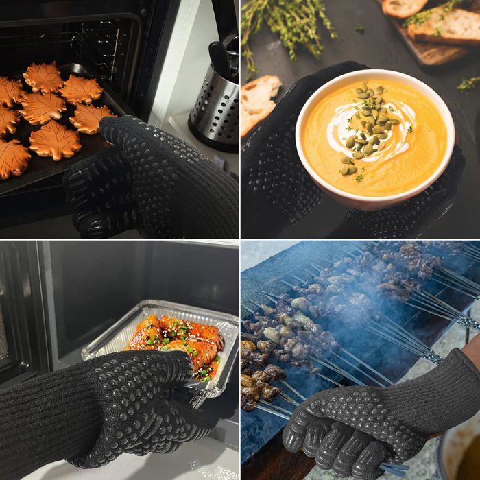 Gants de cuisine universels résistants à la chaleur (jusqu'à KEENSO gants de gril ignifuges Gants de Barbecue, Gants de Cuisson en Coton et Silicone... Gant Cuisine Gants De Cuisine Résistants À La Chaleur 800°C, Gants De Four Gants Protection Thermique Cuisine Gants de cuisine résistants à la chaleur jusqu’à 800 °C, fabriqués en tissu aramide double couche avec doublure coton doux et revêtement en silicone antidérapant, offrant une protection maximale des mains, poignets et avant-bras, parfaits pour le barbecue, la cuisson au four, la pâtisserie ou toute manipulation d’ustensiles chauds, durables, faciles à nettoyer et confortables à porter. Ces Matériaux Garantissent Durabilité, Protection Maximale Et Nettoyage Facile. Gants de Four en Coton Doublure, 1 Paire de Gants de Cuisine Anti Chaleur pour Barbecue Cuisine... Idéal Pour Manipuler En Toute Sécurité Plaques, Poêles, Casseroles Ou Grilles Chaudes. 【PRAKTISCHE GRÖSSE】 Gant four Les Gants Mesurent 32 Cm De Long, 17,5 Cm De Large Et Pèsent Environ 130 G Par Pièce. Le Motif En Silicone Sur Les Deux Côtés Permet Une Préhension Précise, Une Dissipation Rapide De La Chaleur Et Une Durée De Vie Plus Longue Grâce À L’Utilisation Des Deux Faces. Leur Design Allongé Protège Efficacement Les Poignets Et Les Avant-Bras Contre La Chaleur Et Les Brûlures.