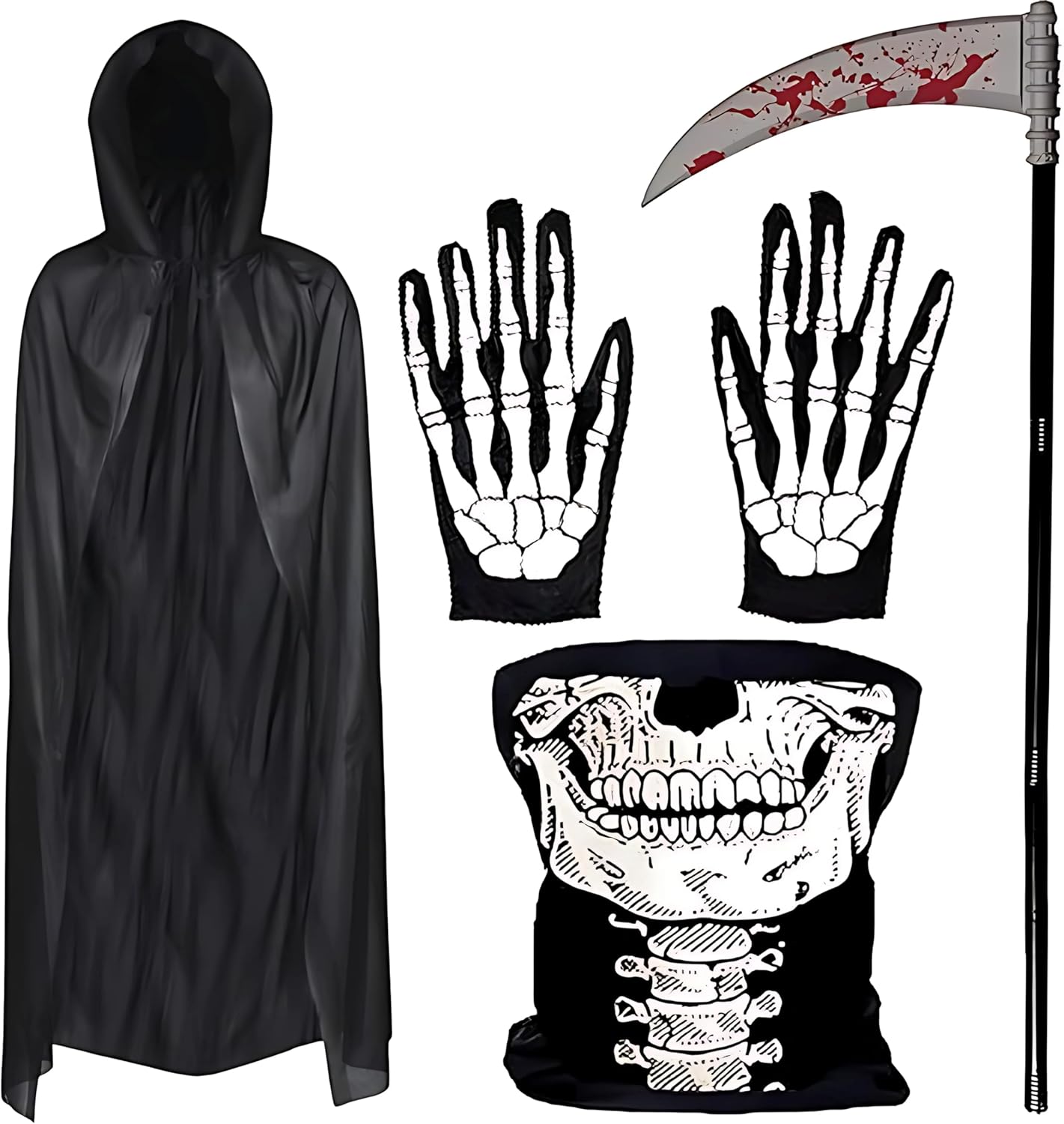 Costume Faucheuse Homme Costume Adulte Modèle La Faucheuse Halloween - Taille Unique Déguisement Accessoire Fête Effrayant Avec Faux Décorative 1 set Costume d'adulte de Faucheuse d'Halloween, comprend 1,4 m de cape, faux, masque, gants, 4 pièces Masque de crâne avec capuche en pvc Ce costume est parfait pour hommes et femmes lors des carnavals, spectacles costumés, décorations de maison hantée et événements d’Halloween, permettant de créer une ambiance sinistre qui impressionnera vos invités. Costume de faucheuse : le costume de faucheuse comprend une cape à capuche noire de 140 cm de long, un masque crâne, des gants de crâne et un accessoire de faux gonflable pour vous assurer d'obtenir un look complet Polyvalent et pratique, il peut également servir d’élément décoratif pour vos scènes d’horreur et vos photos souvenirs. La fausse faux démontable se compose de trois sections qui s’assemblent et se démontent en quelques secondes, offrant un rangement facile et un transport sans contrainte, idéale pour créer un effet dramatique saisissant. Les gants noirs imprimés de squelettes complètent l’ensemble en apportant une finition authentique et un effet visuel renforcé. Le masque crâne en tissu léger et respirant se fixe aisément et vous permet de garder une liberté de mouvement tout en renforçant votre apparence macabre.