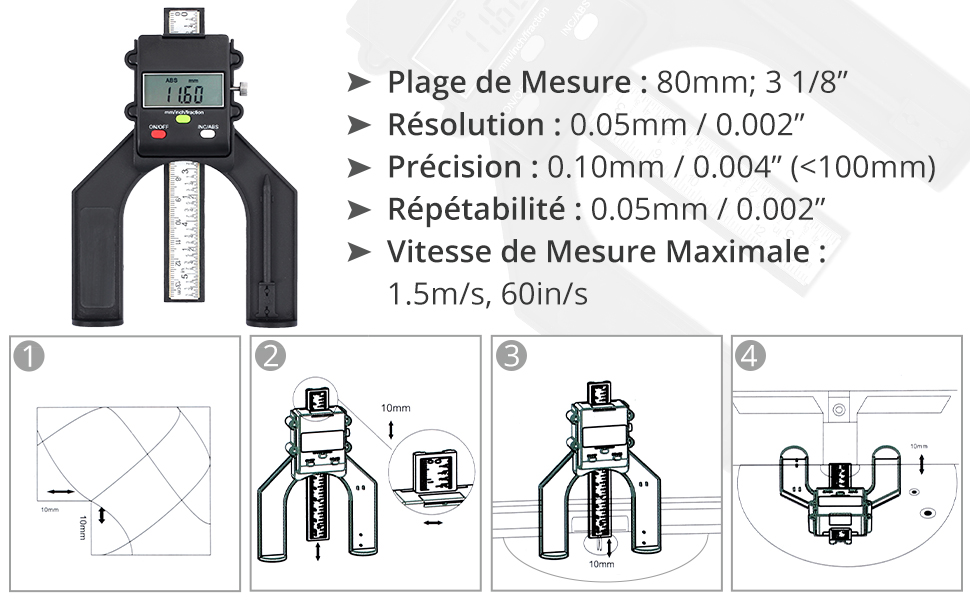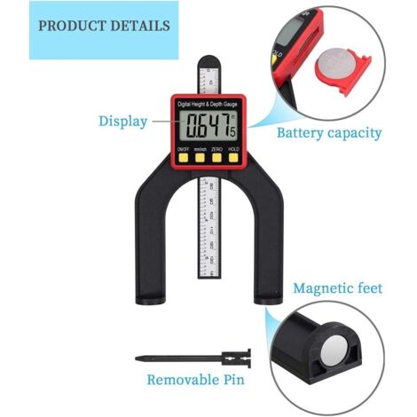 Lntyq Jauge de Profondeur Numérique 0-80mm avec Pieds Autostables... Mesure précise:Avec une résolution de 0,01 mm (0,0004 pouces) et une précision de 0,1 mm (0,004 pouces), cette jauge de profondeur numérique fournit des résultats très précis. Base magnétique:La base magnétique assure une fixation sécurisée à l'équipement en fer, offrant stabilité et précision pendant la mesure. Affichage Digital Conversion Unités Jauge De Profondeur Numérique, Outil De Mesure De La Hauteur Et De La Profondeur Du Travail Du Bois, Résolution De 0,01 Mm, Avec Base Magnétique Base Magnétique Conversion Mm/pouces Outil polyvalent:Cette jauge à double fonction est conçue pour des mesures précises de hauteur et de profondeur, offrant ainsi une commodité dans diverses applications. Mesure précise] Avec une résolution de 0,01 mm (0,0004 pouces) et une précision de 0,1 mm (0,004 pouces), cette jauge de profondeur numérique garantit des... Spec :Type d'article : Jauge de profondeur numériqueMatériau : ABSRésolution : 0,01 mm (0,0004 pouce)Précision : 0,1 mm (0,004 pouce)Batterie : CR2032 1 pile bouton (non incluse)liste de colisage :1 x jauge de profondeur numérique Jauge De Hauteur Pour le Travail du Bois, Jauge De Profondeur
