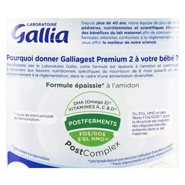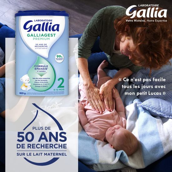 Gallia Galliagest Croissance 3 lait en poudre 800g S'appuyant sur 50 ans de recherche sur le lait maternel, le Laboratoire Gallia a développé cette formule épaissie* pour accompagner bébé et contribuer à répondre à ses besoins nutritionnels spécifiques Lait En Poudre Bébé GALLIAGEST PREMIUM - Lait En Poudre 2ème Âge - De 6 à 12 Mois, Galliagest 2 - Pa Gallia Lait En Poudre Ingrédients Ingrédients : Lactose (LAIT) - Huiles végétales (palme, coprah, colza, tournesol) - Lait écrémé (LAIT) - Amidons - Galacto-oligosaccharides (LAIT) - Lactosérum déminéralisé (LAIT) - Concentré de lactosérum (LAIT) - Protéines de lactosérum (LAIT) - Fructo-oligosaccharides - Huile de poisson (POISSON) - Chlorure de choline - Emulsifiant : lécithine de soja (SOJA) - L-tyrosine - Taurine - L-tryptophane - Inositol - L-isoleucine - L-carnitine - Nucléotides - Antioxydant : esters d'acide gras de l'acide ascorbique - Minéraux (sels de calcium et de magnésium de l'acide orthophosphorique, citrates de potassium et de sodium, chlorures de potassium, de sodiumet de magnésium, sulfates ferreux, de zinc, de cuivre et de manganèse, carbonate de calcium, iodure de potassium, sélénite de sodium) - Vitamines (A, B1, B2, B3, B5, B6, B8, B9, B12, C, D3, E, K1). ENRICHI EN VITAMES : La formule Gallia Calisma contribue au bon fonctionnement du système immunitaire et soutient le développement cérébral et osseux normal de votre bébé. Laboratoire Gallia - Galliagest Premium 2ème Âge - Lait en Poudre pour Bébe - Enrichi en Fibres, Vitamines A, C, D & Oméga 3 - Pour Bébe de 6 Mois à 12 Mois... DE 6 A 12 MOIS : Le lait en poudre Gallia est adapté à votre enfant à partir de 6 mois et jusqu'à 12 mois Ce lait de croissance contient 33x plus de fer que dans le lait de vache LABORATOIRE GALLIA : Inspirée par plus de 50 ans de recherche, le laboratoire Gallia est une marque B Corp qui s'engage à développer des produits de qualités et donne accès à des service utiles comme l'application Laboratoire Gallia & Vous Lait Gallia pour bébé 0-6 mois Sans Arômes, Sans Conservateurs (Conformément à la réglementation)