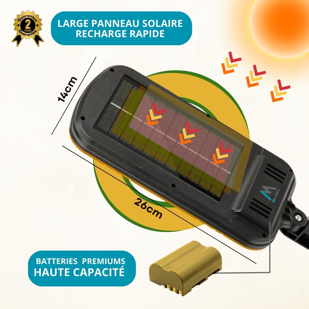 Les lampes à capteur solaire peuvent être vissées sur toutes les surfaces dures telles que les murs, les clôtures en bois et les cadres de porte de garage ou attachées aux arbres ou aux poteaux avec les sangles d'attache fournies. Notre projecteur solaire extérieure MONZER est un dispositif d'éclairage innovant, conçu pour allier efficacité énergétique et durabilité, tout en s'intégrant harmonieusement dans n'importe quel environnement extérieur. 【Éclairage Ultra-lumineux Amélioré】117 LEDs dernière génération, lumière blanche puissante de 6000K pour une visibilité optimale et plus de sécurité la nuit. Panneau solaire monocristallin en PET, rendement de 24 %, recharge rapide et solution écoénergétique. Installation/Fixation en mode EASY On pense à tout ! Lampe Solaire MONZER - Éclairage PUISSANT & UNIFORME 3 modes d'éclairage avec télécommande Mode 1 : Lorsqu'une personne est détectée la nuit, le projecteur solaire s'allume à 100 % de luminosité et s'éteint au bout de 20 secondes. Efficace et écologique, notre lampe solaire est parfaite pour illuminer et sécuriser les espaces extérieurs tout en respectant l'environnement. Elle présente un design moderne avec des matériaux résistants aux intempéries et canicules. Mode 3 : S'allume automatiquement la nuit avec une luminosité de 30 %. Facile à installer : Fourni avec le matériel de montage, l'installation peut être réalisée en quelques minutes. MONZER Projecteur Solaire Extérieur, 117LED/3000LM ... Solaire de Sécurité pour Jardin Garage [2 Pièces] [Classe énergétique A ] ... LOT DE 3 Tommy... Ce lot de 2 est idéal pour sécuriser vos extérieurs. 【Installation Facile】Chaque colis est équipé de vis et de sangles d'attache pour vous permettre d'installer les lumières là où vous en avez le plus besoin. Recharge RAPIDE & Autonomie MAX Panneaux solaires à haut rendement énergétique Le panneau solaire agrandi a un taux de conversion allant jusqu'à 23 % et charge efficacement la batterie haute capacité intégrée. Vous l'avez compris: il peut être implanté dans tout décor exterieur! À date, la satisfaction client s'élève à 93% et nous continuerons à s'améliorer. OU MONZER [Lot de 2] 117 LED Lampe Solaire Extérieur Notre service après vente vous apportera une solution satisfaisante dans un délai de 48 heures. Luminaire exterieur solaire detecteur mouvement Luminaire exterieur solaire detecteur mouvement : la sélection produits Leroy Merlin de ce dimanche au meilleur prix ! Retrouvez ci-après nos 2086 offres, marques, références et promotions en stock prêtes à être livrées rapidement dans nos magasins les plus proches de chez vous Ce dernier mode permet un recharge rapide en 2 heures seulement tout en limitant la consommation électrique. Spot Solaire Exterieur Lampe Solaire Avec Détecteur De Mouvement Projecteur Puissant 3000Lm 85 Lampe Solaire Détecteur Mouvement 117 LED 3000LM Lot 2 【Format Compact】Le projecteur Solaire MONZER est conçu pour être discret jour et nuit tout en restant puissant. 【2 Modes d'installation Outdoor/Indoor】Un câble de 3m est fournis permettant l'installation du projecteur et son panneau solaire en mode séparé, vous pouvez alors fixer la lampe à l'intérieur ou à l'extérieur, ce qui rend cette solution encore plus utile et efficace que les lampes solaires avec panneaux intégrées. 【2 Modes de Recharge Solaire/Electrique】Conception innovante, modèle amélioré 2025 : Ce projecteur solaire MONZER est idéal pour utilisation en été et hiver car il offre un mode de recharge classique via un panneau solaire et un mode de recharge électrique via un port USB. Projecteur Solaire Extérieur - Étanche IP65 Robuste tout le long de l'année Le projecteur solaire MONZER est fabriqué en plastique ABS robuste et peut fonctionner dans des conditions météorologiques allant de -30 à 60°C pour une longue durée de vie. 【GARANTIE ET SUPPORT】MONZER - marque 100% FRANÇAISE offre une garantie de 24 mois pour les lampes solaires extérieures avec détecteur de mouvement.