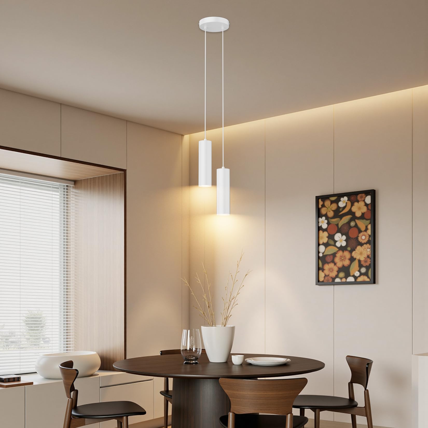 Suspension Luminaire SLV 133489 LIGHT EYE Pendelleuchte GU10 Kupfer A Lustre Salon NETTLIFE Plafonnier Blanc moderne : 6 spots de plafond orientables, en... Suspension Pour îlot Cuisine Salle à Manger Klighten Suspension Luminaire Cylindre GU10, Lampe Suspension 2 Sopts Moderne Pour Salon Chambre Cuisine Table à Manger, Hauteur Réglable, Blanc, Ampoule Non Incluse Suspension Cuisine îlot Design moderne : Cette suspension arbore un design cylindrique, simple et élégant, idéal pour les îlots de cuisine, les cuisines, les tables à manger, les tables de chevet, les couloirs, les salons, les chambres, les vérandas et autres espaces intérieurs Hauteur du corps de la lampe : 30 cm, diamètre : 5,5 cm, diamètre de la base : 6 cm, longueur du câble : 125 cm Design moderne : cette suspension cylindrique, au design simple et élégant, s'intègre parfaitement aux îlots de cuisine, cuisines, tables à manger, tables de chevet, couloirs, salons, chambres, vérandas et autres pièces de la maison. Hauteur réglable : la hauteur de cette suspension est ajustable. Lors de l'installation, vous pouvez modifier la longueur en desserrant les vis de... Lors de l'installation, vous pouvez modifier la longueur en desserrant les vis de fixation du câble. Douille GU10 : La suspension utilise une douille GU10 pour un remplacement facile de l'ampoule (puissance maximale 40 watts). La bague avant amovible facilite l'installation et le remplacement des ampoules, mais pour votre sécurité, il est recommandé de faire appel à un électricien qualifié pour l'installation L'ampoule présentée sur la photo n'est pas fournie.