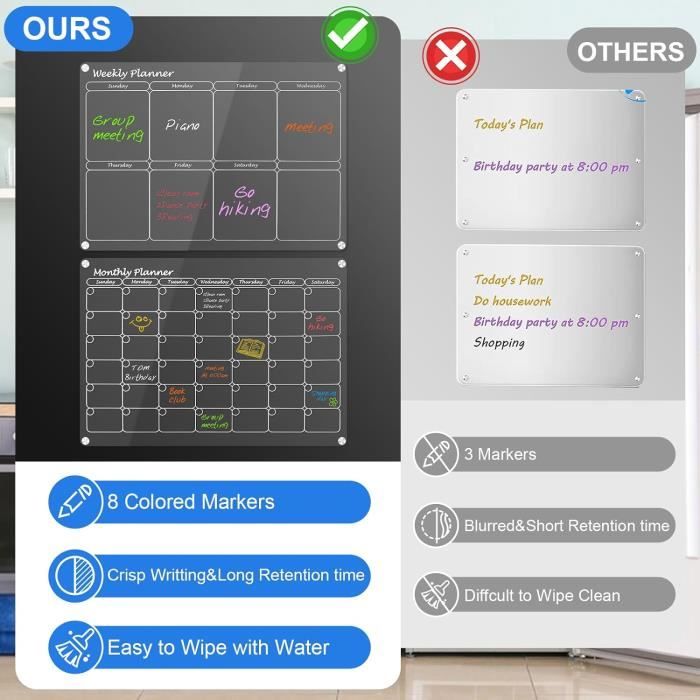 Grâce à ces tableaux, vous pouvez facilement planifier votre emploi du temps pour les jours, les semaines et les mois à venir et vous souvenir des jours importants. Organisateur Frigo MagnéTique 2 Panneaux Acryliques RéUtilisables 2 tableau magnetique frigo en acrylique, 6 marqueurs de 6 couleurs vives, 1 porte-stylo magnétique, 1 crochet magnétique et une serviette. Tableau Magnétique Frigo Transparent Langaelex Lot De 2 Calendriers Magnétiques Frigo 40x30cm Tableau Tableau Organisation Familial Il calendrier frigo convient également comme cadeau d'anniversaire pour les enfants, afin que les parents et les enfants puissent gérer leur temps ensemble. Planning frigo magnetique Ce semainier magnétique vous permet de planifier clairement vos repas quotidiens et vos courses du lundi au dimanche. YIAKJ Lot de 2 Calendrier agnétique Frigo - 40 x 30c Planificateur Hebdoadaire Calendrier... 🌿TRUSTFUL BUY - Acrylic Tableau Magnetique Frigo Dry Erase est conçu pour vous aider à vous organiser et à planifier votre vie quotidienne. Le planning frigo magnetique ne prend pas de place, peut être facilement démonté, très pratique. Une bonne qualité à prix abordable. ... Dimensions : 19,8 x 11,9 x 0,5 cm., Poids : 100 g. Taille et poids : la taille du tableau de contrôle quotidien est de 19... Le calendrier frigo pour réfrigérateur est spécialement conçu pour votre vie quotidienne, enregistrer votre liste de tâches quotidiennes, hebdomadaires ou mensuelles, idéal pour la planification de votre vie quotidienne / hebdomadaire, la planification des repas, le travail, le sport. 🎉2 PCS PLANNING FRIGO MAGNETIQUE - Le calendrier magnetique frigo transparent est fabriqué en acrylique de haute qualité, qui est durable, lisse et facile à écrire. ✍️SCHREIBEN ET FACILE A EFFACER - Le tableau transparent frigo ensemble pour réfrigérateur comprend 6 couleurs différentes de marqueurs, l'écriture est brillante et lisse, il suffit de l'essuyer avec une serviette humide ou du papier essuie-tout sans laisser de taches ou de fantômes. Le tableau magnetique frigo transparent acrylique transparent offre une grande durabilité et un aspect minimaliste. Ce planning frigo magnetique en acrylique effaçable et tableau vierge pour le tableau d'horaire de réfrigérateur convient à la plupart des réfrigérateurs et a suffisamment d'espace pour enregistrer des notes / événements / repas.