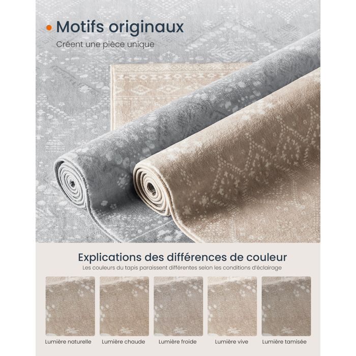 [Doux et sûr] Fabriqué en fibres 100 % polyester, ce tapis est doux au toucher. Il est certifié conforme à la norme OEKO-TEX Standard 100 et est agréable au contact de la peau. La surface dense et moelleuse de ce tapis procure une sensation de douceur et de confort sous les pieds. Le tapis est mesuré à plat, donc une différence de dimensions de ±2-3 cm est considérée comme normale. Ils permettent également de délimiter les espaces, ce qui est particulièrement intéressant pour les intérieurs ouverts de type loft. Les tapis SONGMICS sont faciles à nettoyer et à entretenir, pour une beauté durable. Choisissez SONGMICS, où la qualité se conjugue avec l’élégance et la fonctionnalité [Élégance sobre] La subtile couleur blanc crème confère à ce tapis un charme à la fois simple et élégant. 1 x Sac de rangement Le tapis est fabriqué en polyester de qualité. Tapis Polyester Doux Moderne SIMPEX Tapis Blanc 160x220 Cm Tapis à Poils Courts Lavable, Doucement Antidérapant Et Design Monochrome Moderne Pour Salon, Chambre, Cuisine Et Chambre D'enfant Tapis Déco Salon SONGMICS HOME Tapis Décoratif, Tapis de Chambre 160 x 230 cm, Antidérapant, Lavable en Machine, Style Bohème, Beige Cappuccino ... -15€ dès 129€ d'achat, code... Même après plusieurs lavages en machine, il maintient sa qualité [Antidérapant et multi-usages] Le verso de ce tapis décoratif comporte du TPR aux performances antidérapantes supérieures, et convient donc parfaitement à de nombreux types de sols, y compris le parquet, le carrelage, etc Il est certifié OEKO-TEX standard 100 et répond aux normes les plus strictes en matière de sécurité textile (certificat n° SHO25 152 411, présenté par le fournisseur) Il s’intègre parfaitement à toutes les pièces, que ce soit une chambre ou un salon, et insuffle une ambiance paisible à votre espace de vie Tapis décoratif Beige Lin esprit Berbère 160 x 230 cm [Durable et lavable en machine] Conçu pour durer, ce tapis de chambre conserve la douceur de sa texture même après une utilisation prolongée, sans perdre ses fibres. Embellissez votre intérieur dès aujourd’hui avec nos magnifiques tapis décoratifs ! Matériaux : Polyester, feutre, TPR (caoutchouc thermoplastique), Dimensions :, Longueur : 230 cm, Largeur : 160 cm, Poids : 5,9 kg, Livraison : 1 x Tapis Choisissez SONGMICS, où la qualité se conjugue avec l’élégance et la fonctionnalité.