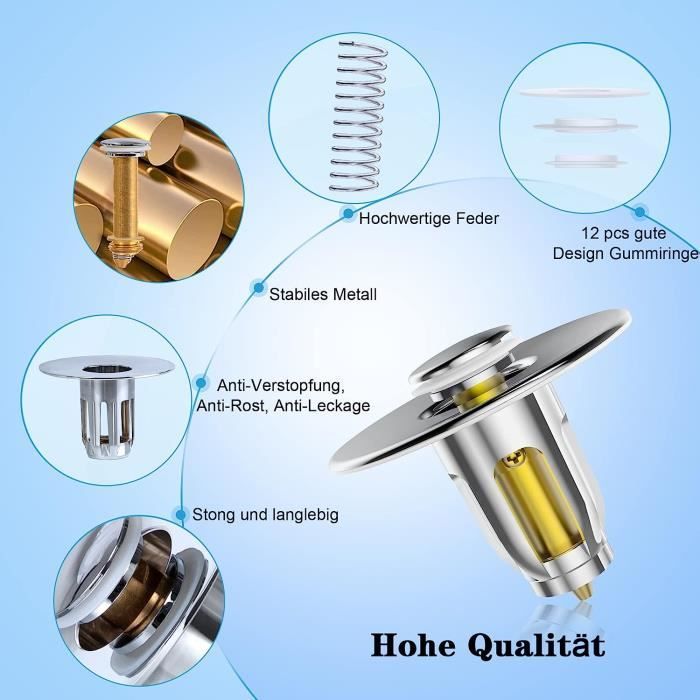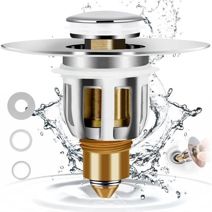 XTRÊMEMENT FONCTIONNEL : Ce bouchon de lavabo universel intègre un filtre amovible qui capture efficacement les cheveux, résidus et débris, évitant les bouchons. Hibbent - Bonde universelle en métal pour lavabo de salle de bain, compatible avec bassin de 28 mm ~ 58 mm, filtre de vidange pop-up, bonde à poussoir en... Les trous de vidange uniformes et le joint en silicone garantissent une étanchéité parfaite et une évacuation fluide Grâce à sa conception pop-up, basculez instantanément entre le mode de rétention d'eau et le drainage rapide d'un simple appui. Bouchon Lavabo Pop-up Acier Inoxydable Bonde De Lavabo PopUp,Bouchon Lavabo Universel Bonde De Lavabo Acier Bonde évier Acier Inox Filtre MÉCANISME POP-UP PRATIQUE : Appuyez légèrement pour basculer entre le mode rétention d'eau et drainage rapide. Fabriqué en acier inoxydable de haute qualité et doté d'un noyau en laiton robuste, il résiste à la corrosion et aux conditions humides, garantissant une utilisation prolongée sans altération. La structure étanche isole les odeurs et insectes, assurant une hygiène optimale INSTALLATION SANS OUTIL : Insérez simplement la bonde lavabo dans l'orifice d'évacuation. Le panier filtrant se retire d'un simple geste pour un nettoyage facile et rapide Le système de fermeture étanche avec joint en silicone empêche les remontées d'odeurs et les infiltrations d'insectes, préservant l'hygiène de votre espace. Que vous soyez en rénovation ou en installation neuve, ce bouchon de vidange saura répondre à vos attentes en termes de fonctionnalité et d'esthétique. Petits prix et livraison gratuite dès 25 euros d'achat sur les produits GAESHOW. Commandez GAESHOW Lot de 2 filtres d'évacuation pour lavabo Pop Up 3 en 1, bouchon d'évier de salle de bain universel avec filtre et filtre amovible en acier inoxydable, noyau à bille en laiton, 30-40 mm Le filtre lavabo amovible capture efficacement les cheveux, les résidus alimentaires et autres débris, prévenant ainsi les obstications et facilitant l'entretien au quotidien. ADAPTABILITÉ MULTI-USAGES : Ce raccord de drainage pour salle de bains convient aux lavabos et s'adapte à la plupart des diamètres standard. LaBlanc - Bouchon de Lavabo, Pop-Up Universel avec Flitre Cheveux de