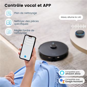 【Conception Anti-Enchevêtrement】Le L6 adopte un design innovant en V, éliminant définitivement les enchevêtrements de poils avec la brosse rouleau. Corps léger - Peut Nettoyer Tous les Coins Reconnaissance Automatique des Motifs de Tapis (Bac à poussière : 450ml / Réservoir d'eau : 250ml) Compatible avec Alexa et Google Assistant, il s'active par commandes vocales simples. Il aspire ET lave en même temps avec une puissance d'aspiration de 4000Pa qui vient à bout de tout. Son réservoir d'eau de 250ml et son bac à poussière de 450ml... grâce à cinq modes de nettoyage, tels que point fixe, bord, zigzag, aléatoire et automatique. Il propose plusieurs modes : aspiration seule, lavage seul, ou ensemble. 1 Aspiration 4000pa 2 Anti-enchevêtrement 3 Contrôle Intelligent Robot Connecté Alexa Wifi VersLife L6 Robot Aspirateur Laveur, 2 En 1 Aspirateur Robot Aspirateur Robot WiFi Alexa VersLife Robot Aspiradora y fregona Cobo, Aspiradora robótica 2 en 1 con succión de 3000 Pa... 【5 Modes de Nettoyage】Le VersLife L6 peut facilement faire face à différents besoins de scène, sols et tapis, etc. Plus efficace que les aspirateurs robots équipés de brosses rotatives classiques, il garantit un nettoyage sans accrochage de cheveux ou poils. Sa forme en V crée un effet de concentration des débris, permettant de décoller efficacement les particules tenaces sur les sols et la poussière logée dans les interstices entre carrelage et plancher. 【Ce que vous Obtiendrez】 Balayeuse VersLife L6 x 1, télécommande x 1, brosse de nettoyage x 1, base de chargement x 1, filtre HEPA x 2, manuel d’instructions x 1, réservoir d’eau x 1, brosse latérale x 4, vadrouille x 2, adaptateur x1, support de vadrouille x1, réponse rapide dans les 24 heures et service après-vente de 24 mois. Avis robot aspirateur laveur VersLife L6 - Avis caméra Avec seulement 7 cm de hauteur, il glisse facilement sous les meubles, canapés et espaces exigus, garantissant un nettoyage approfondi des zones difficiles d'accès. 【Aspiration Puissante de 4000 Pa】Le L6 utilise le principe de fonctionnement du moteur à courant continu sans balais et dispose de trois niveaux d'aspiration puissante. 【2-en-1 Aspiration et Lavage】Le VesrLife L6 intègre l'aspiration et le nettoyage en un seul appareil, effectuant des tâches de nettoyage complètes en une seule fois. (*Remarque : Compatible uniquement avec le Wi-Fi 2., 4G)