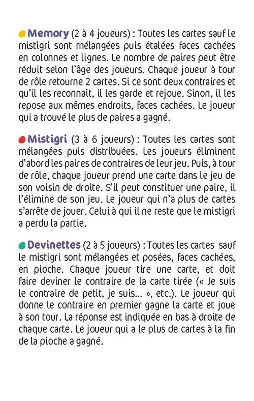 Vocabulaire Les Contraires Ce1 – Liste Des Contraires Ce1 – SCLH Jeu Des Contraires | Contraire Des Mots, Jeux Mémoire avec Jeux De... Jeu Cartes Contraires Enfants Le Memory Des Contraires : Pour Enrichir Son Vocabulaire Memory Des Contraires 5 Jeux Dans la collection Récré en Boîte, le jeu de cartes Je joue avec les contraires dès 3 ans, propose 5 jeux simples et amusants autour des contraires pour enrichir le vocabulaire de votre enfant et stimuler ses capacités de mémorisation Memory – mistigri – devinettes – paire - bataille Une approche pédagogique par les jeux de cartes, de 2 à 6 joueurs, qui permettent à votre enfant de : • Renforcer sa compréhension du concept des contraires • Enrichir son vocabulaire (42 mots de la vie quotidienne) • Stimuler ses capacités de mémorisation • Développer sa rapidité • Apprendre à s'autocorriger Et en + :- 42 belles cartes cartonnées en grand format, joliment illustrées - Des règles de jeu faciles à comprendre - Une jolie boîte rigide pour les transporter partout ! Dans son joli boîtier coloré et solide, retrouvez 5 jeux de cartes en un, autour du concept des contraires !