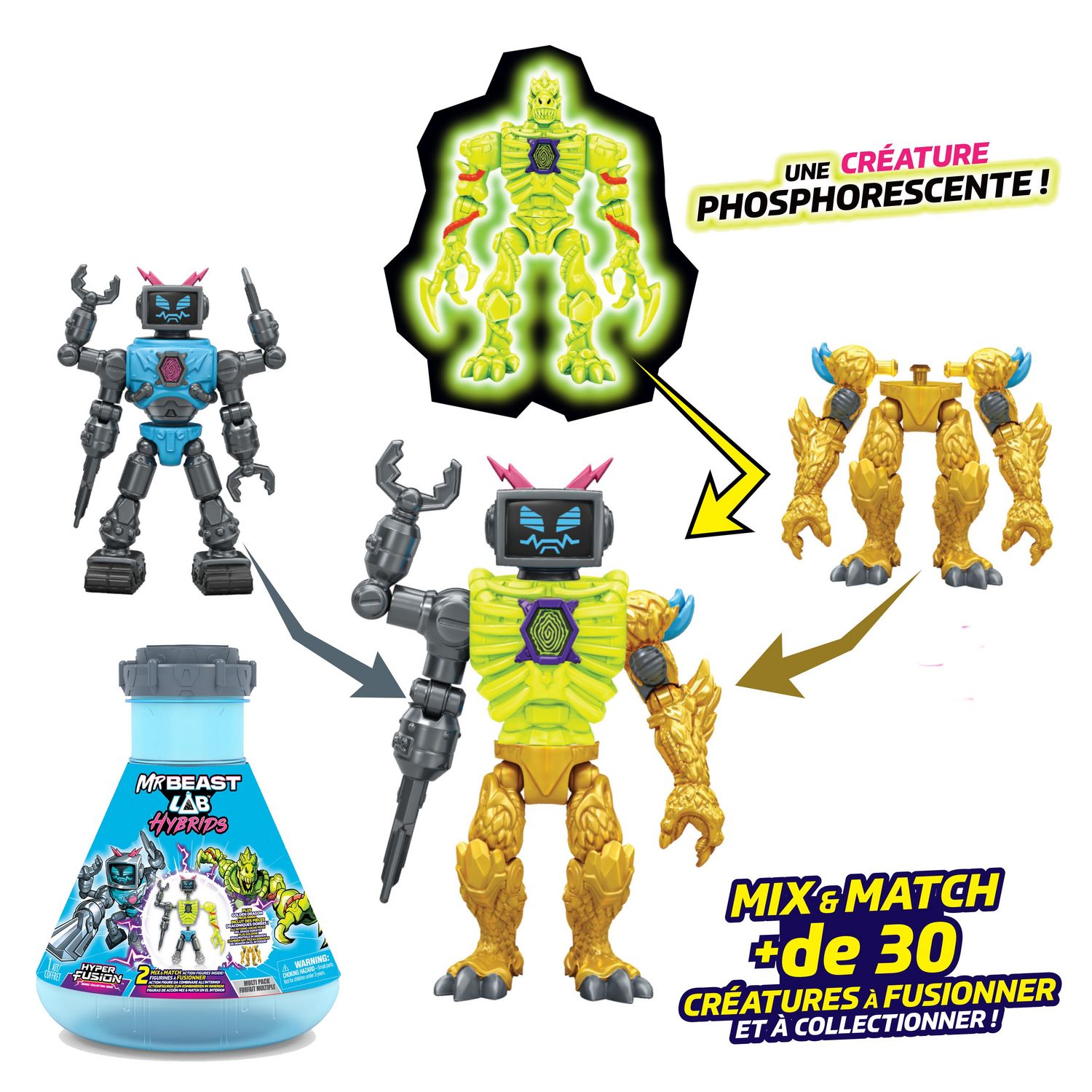 Commence par dévisser le bouchon du contenant : une bande de sachets en aluminium se cache à l'intérieur ! MrBeast Lab - Coffret 14 Mini Figurines Mystères Swarms Série Hyper Fusion | Smyths Toys France Combine dix créatures différentes : découvre 10 figurines MrBeast Lab différentes dans les coffrets individuels et combine-les pour créer l'hybride suprême., Mr Beast Jouet Crée Le Monstre Suprême Avec Les Millions De Combinaisons Des Figurine Mr Beast Essaie des millions de combinaisons pour donner vie à une figurine MrBeast surpuissante ! Avec plus de 30 créatures à collectionner, dont des figurines rares, ultra rares, en édition premium et la légendaire Hybrid Hyperchrome Panther en édition limitée (il n'y en a que 1 000 en tout ! MrBeast passe en mode jouets avec les MrBeast Lab Hybrids ! Des créatures hybrides, du blind box et un univers de labo un peu fou Tu en... Collectionne-les toutes : il y a plus de 30 créatures hybrides MrBeast Lab à collectionner dans la collection Hyper Fusion. Avertissement De Sûreté AVERTISSEMENT : RISQUE D'ÉTOUFFEMENT – PETITES PIÈCES. Ouvre chaque sachet pour découvrir trois parties du corps différentes, puis fusionne-les pour créer un des dix personnages MrBeast Hybrid à trouver dans les coffrets individuels Chaque coffret individuel contient une créature hybride complète à découvrir. Du haut de leurs 10,16 cm, les figurines MrBeast Lab Hybrids sont dotées de dix points d'articulation pour un maximum d'action ! Crée des millions de combinaisons : fusionne les différentes parties du corps des figurines MrBeast Lab Hybrids. Avec MrBeast Lab Hybrids, le pouvoir de la fusion est entre tes mains. Des figurines de 10,16 cm articulées : fusionne les différentes parties du corps articulées des figurines MrBeast Lab Hybrids.,