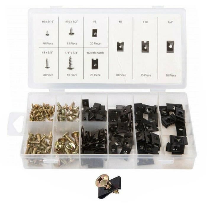 Qiilu Kit de vis autoperceuses 250 pièces vis autoperceuses en acier au Idéal pour la carrosserie automobile, le bricolage ou l'assemblage de structures métalliques, il garantit une fixation rapide, propre et efficace.Chaque élément... Kit Vis Carrosserie Le Spécialiste De La Vente En Ligne De Vis Et De Fixations Pièces Réparation Carrosserie Matériau : métal, plastique Contenu de l'emballage : 16 supports d'écrous en U 16 boulons de voiture. Fixation du garde-boue : les vis de voiture et les pinces en forme de U peuvent être utilisées ensemble pour assurer une fixation plus solide et plus sûre. 100% tout neuf et de haute qualité Les écrous en U offrent une fixation solide et sûre pour les applications où deux panneaux ou plus doivent être maintenus... 24 pinces en plastique 24 vis de voiture à tête hexagonale 28 vis de voiture à tête plate 24 pinces à ressort en U 28 pinces à ressort en U grises Vous pouvez remplacer directement les pièces endommagées pour garder le compartiment moteur propre et prolonger la durée de vie du moteur. Large application : le kit de clips de vis à écrou en tôle convient à la plupart des modèles, largement utilisé pour le remplacement et la réparation des ailes, des pare-chocs, des couvercles de moteur, des plaques de châssis, des plaques d'immatriculation de voiture et de moto, des grilles de radiateur, des garnitures de porte intérieure, etc. Installation facile : les vis et les serre-écrous sont parfaitement travaillés et ne glissent pas facilement lors de l'installation ; les filetages profonds et transparents ont une force de morsure élevée, ce qui facilite l'installation et améliore l'étanchéité.