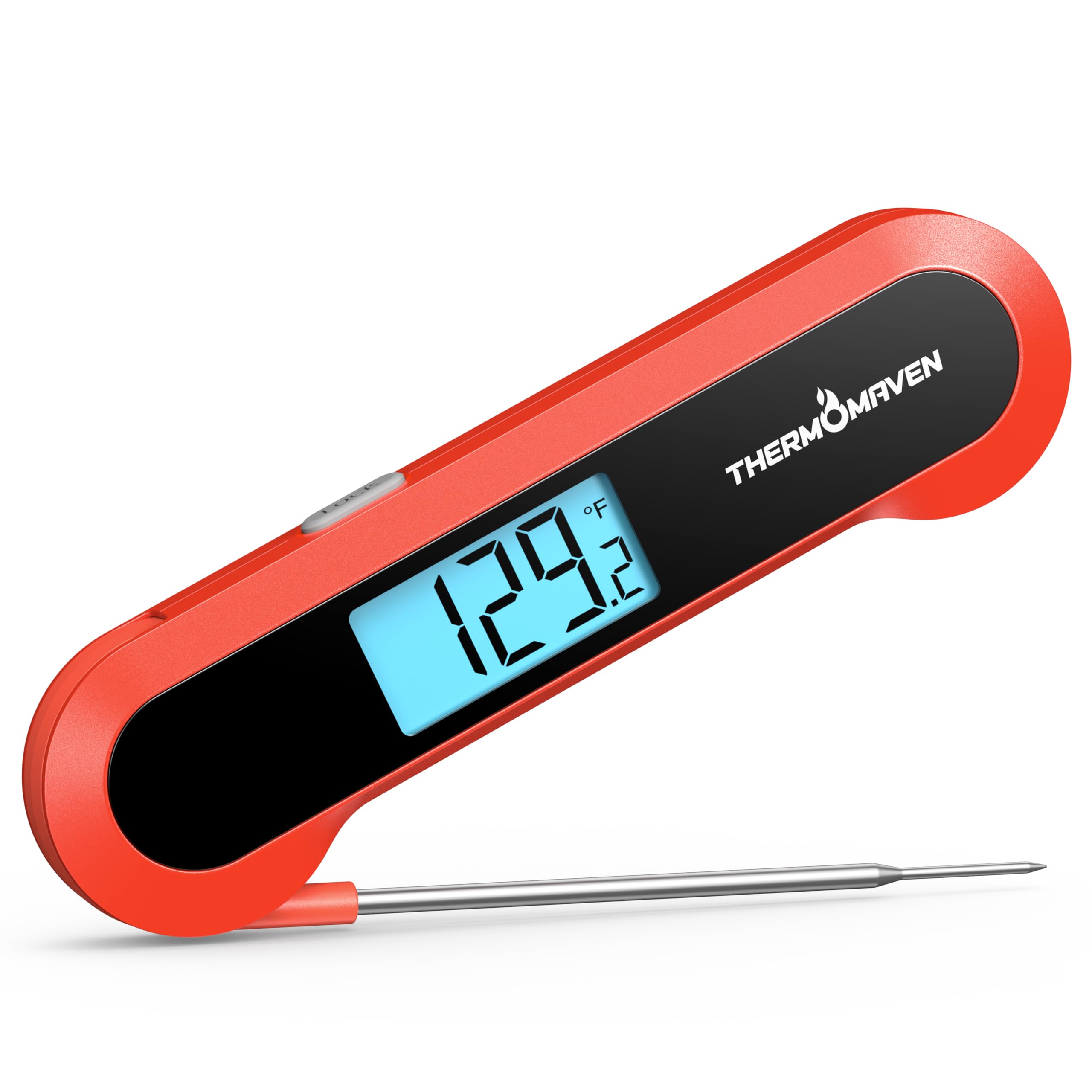 ThermoPro TP605 Thermomètre numérique à lecture instantanée de la viande Manuel d'instructions Toujours à portée de main : Doté d'un puissant aimant intégré à l'arrière, il se fixe facilement à votre réfrigérateur, à votre hotte aspirante ou à toute autre surface métallique. L'appareil s'allume instantanément dès que vous le prenez en main et passe automatiquement en mode veille après une période d'inactivité, prolongeant ainsi l'autonomie de la batterie. Écran LCD à bascule automatique : Doté d'un grand écran LCD à contraste élevé, il se bascule automatiquement pour rester en position verticale, que vous l'utilisiez de la main gauche ou de la main droite. Lecture Instantanée 0.5 Seconde Thermomètre à Viande Numérique à Lecture Instantanée - Thermomètre De Thermomètre Certifié NIST Sa luminosité exceptionnelle assure une lecture parfaite en plein soleil ou lors d'un barbecue nocturne. Lectures ultra-rapides et ultra-précises : Obtenez des températures précises en seulement 0,5 seconde grâce à notre capteur thermocouple professionnel de pointe. Certifié NIST avec une précision remarquable de ±0,5 °F, vous pouvez cuisiner en toute confiance et garantir que chaque steak, rôti et pâtisserie est cuit exactement à votre goût. Thermomètre à viande numérique professionnel, lecture instantanée en 0,5 seconde, certifié NIST, précision de ± 0,5 °F, affichage à retournement automatique, 100 % étanche, bleu