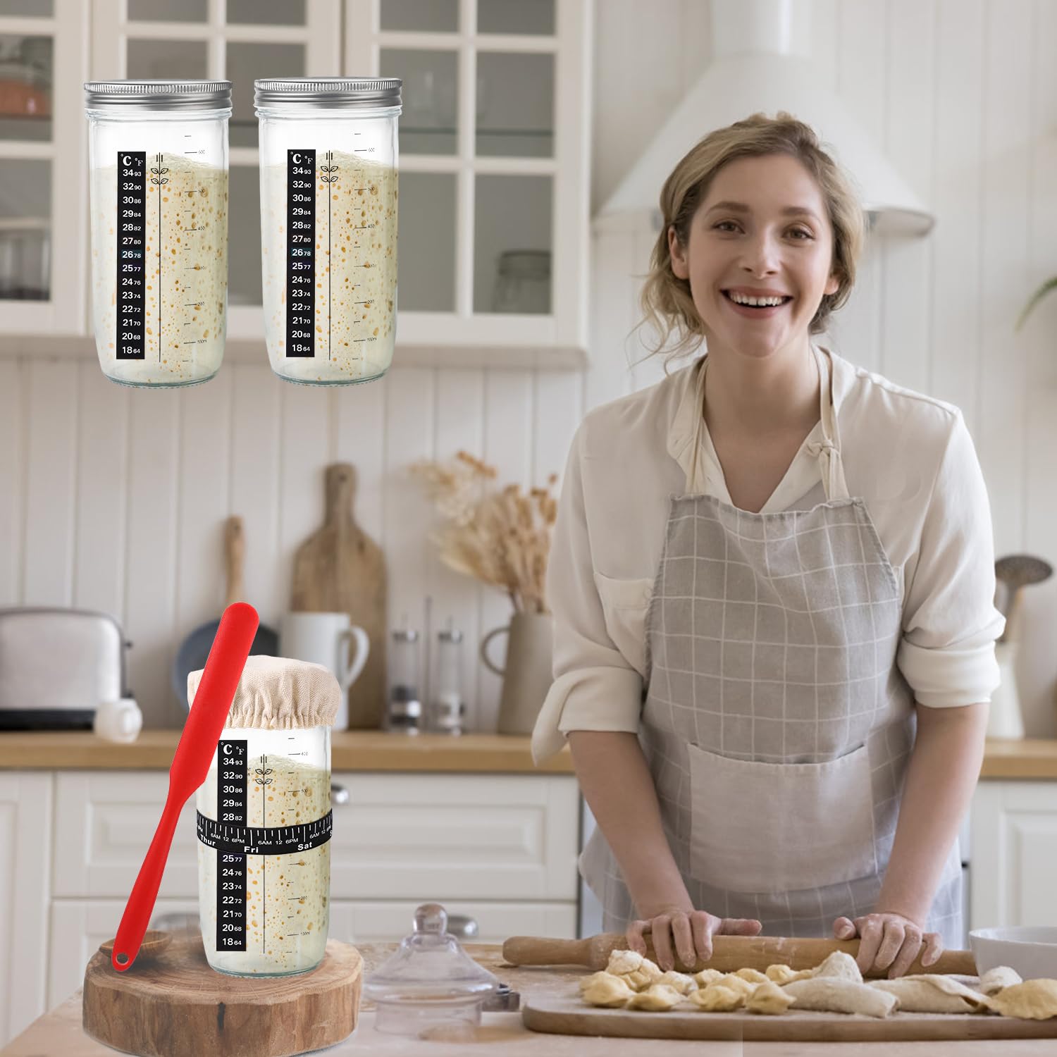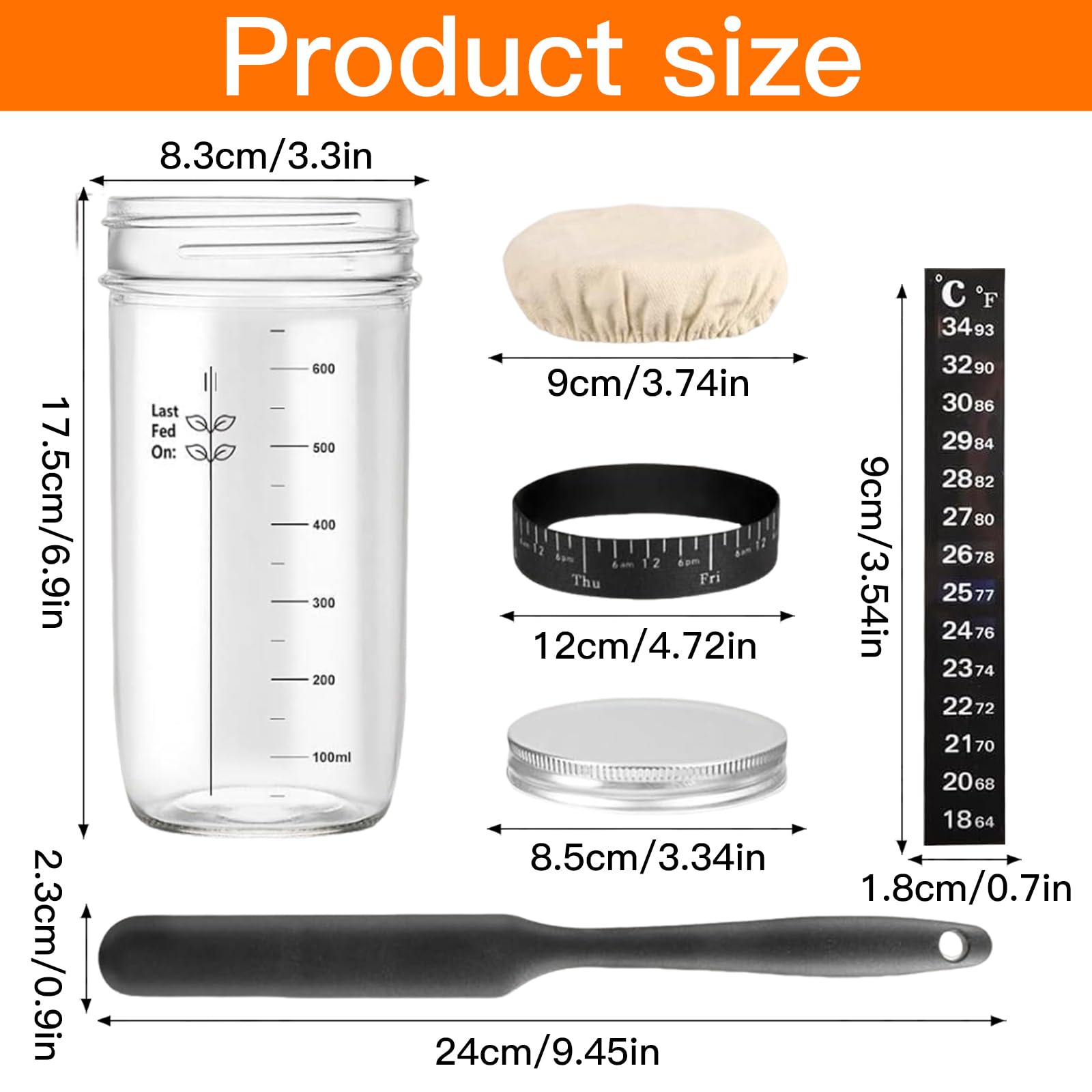 Kit de démarrage au levain – Pot à levain facile à utiliser et à nettoyer, sans BPA et réutilisable, bocal en verre avec couvercle en aluminium – Kit de démarrage pour pain Pot De Démarrage Au Levain : Outre la fermentation, le récipient bouteilles de levain pour pain peut également contenir des ingrédients secs et humides tels que la levure, les céréales, le café et les noix, ce qui le rend plus pratique. Bocal Démarrage Levain 680ml - Kit Avec Ruban Datation Thermometre Couvercle Et Spatule 99265101 Pot Levain Verre Thermomètre Ce récipient d'une capacité de 680 ml (environ 24 onces) est doté d'une large ouverture permettant d'ajouter facilement de la farine et de l'eau, ainsi que de le nettoyer, pour une utilisation hygiénique et pratique. L'astuce pour préparer facilement votre pain au levain : un kit de conservation pour garder votre levain dans les meilleures conditions ! Ce kit de démarrage vous accompagne dans la confection de votre propre levain Kit de démarrage de pain au levain Pro Pot de fabrication de pâte aigre... Double étanchéité et ventilation : bocal de démarrage pour levain est livré avec un couvercle en tissu respirant ou un couvercle en aluminium scellé. Suivi intelligent et gestion précise : bocal de démarrage pour levain est équipé d'un ruban thermosensible intégré pour un suivi en temps réel de la température de fermentation, et d'un marqueur de date pour suivre les cycles d'alimentation et éviter les erreurs de manipulation. Sa conception transparente et son large goulot s'adaptent aux différentes étapes de fermentation, permettant aux boulangers débutants comme professionnels de maîtriser rapidement le processus. Bocal de démarrage pour levain : Fabriqué en verre alimentaire, pot de démarrage au levain est résistant à la chaleur et hautement transparent, permettant un suivi en temps réel de la fermentation. Les parois latérales du récipient sont graduées pour mesurer le volume de levain, ce qui le rend adapté à la boulangerie domestique et professionnelle. Spécifications : Nom du produit : Bocal de démarrage pour levain Capacité : 680 ml Matériau : Verre Dimensions : 17,5 x 8,3 cm Contenu de l’emballage : 1 x Bocal de démarrage pour levain 1 x ruban thermométrique 1 x grattoir 1 x couvercle en tissu 1 x couvercle métallique 1 x ruban de fermentation avec dateur