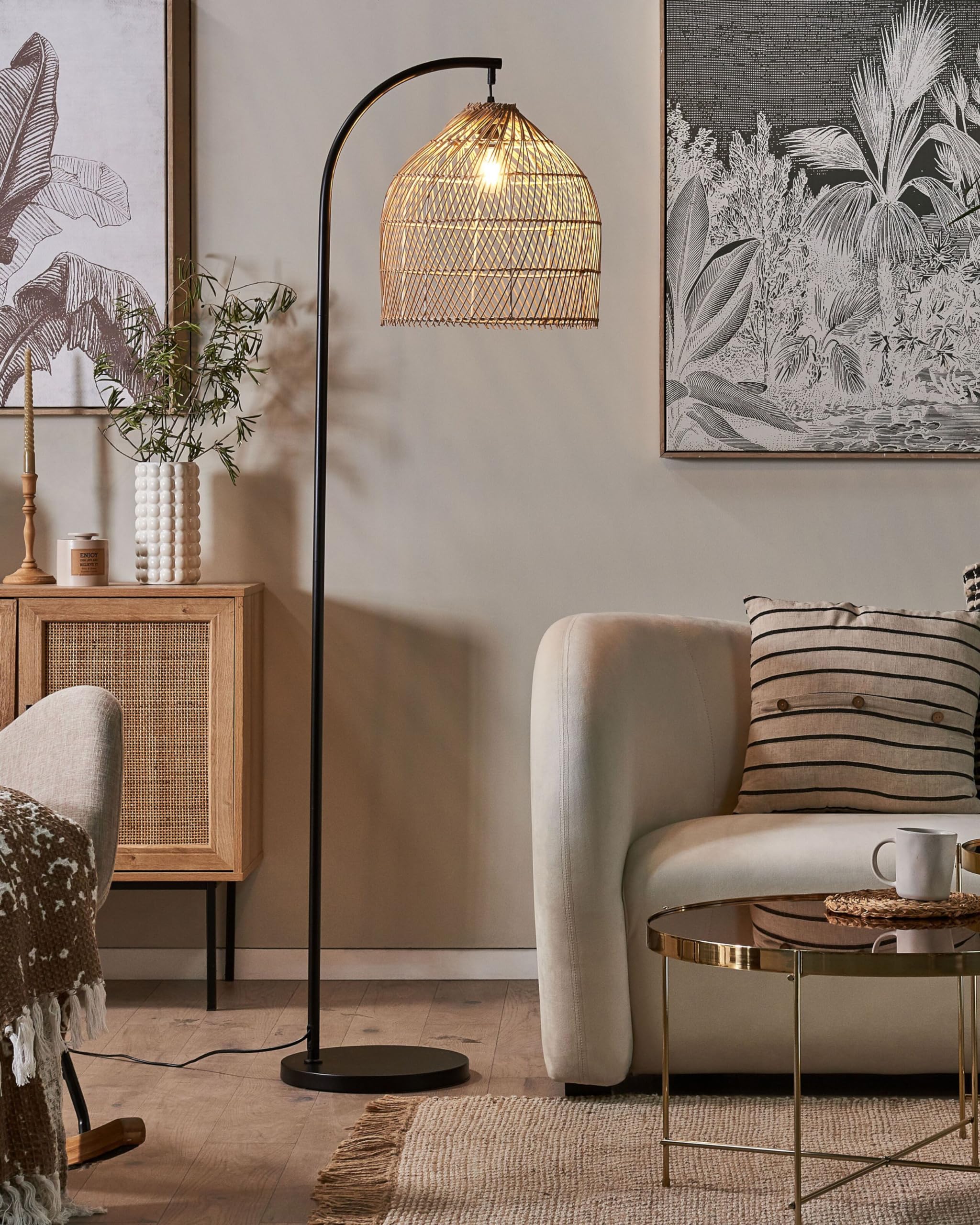 Lampadaire Boho En Rotin Abat-jour Ouvert Bras Métallique 165 Cm Bras Mtallique Dco Boho Lumire De Salon Naturel 57438118 La combinaison parfaite du style industriel moderne et r tro avec un abat-jour noir en lin convient diff rents styles d'int rieur. Taille de l' cran 340 * 210 mm. Avec la lampe LED 3000K fournie, vous pouvez facilement cr er une ambiance chaleureuse Bois Lightbox Boho Lampe à Arc - 1,7 M De Hauteur - Lampe Sur Pied Avec Abat-jour En Tissu/métal & Tête Pivotante & Interrupteur à Pied - E27, Max. 52 W Lampadaire Salon Elle est utile dans le salon, derrière le fauteuil, comme lumière de lecture agréable ou comme complément à la lumière principale de la pièce. Des ampoules LED respectueuses de l'environnement peuvent également être utilisées. Rayofly Lampadaire Boho, lampadaire 3 lumières en rotin avec étagère, lampadaire industriel avec interrupteur à pied et abat-jour en rotin, lampadaire haut... Convient aux lampes normales, mais aucune ampoule n'est incluse. L'interrupteur au pied permet d'allumer agréablement la lampe à arc. STABLE - en raison de sa taille, le lampadaire dispose d'un pied métallique extra lourd qui le maintient toujours en équilibre NATURE STYLE - La combinaison de la structure noire mate et du rotin tressé ouvert donne au lampadaire un caractère très moderne et proche de la nature