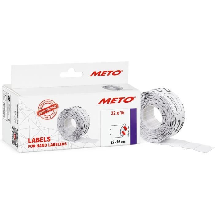 12 rouleaux d’étiquettes de 1 000 étiquettes chacun, total : 12 000 étiquettes Etiqueteuse Manuelle METO Proline - Etiqueteuse 2 Lignes - Fourni Avec 1000 étiquettes étiquettes Repositionnables La marque Meto est mondialement connue pour ses solutions d’étiquetage et de promotion des ventes de première qualité, destinées au secteur du commerce et à toute sa chaîne d’approvisionnement. Ligne d'impression : 2 Ligne 1 : 8 (chiffres € £ $ - . /) Ligne 2 : 8 (chiffres € £ $ - . /) Nombre total de caractères : 16 ( chiffres € £ $ - . / ) Compatible toutes les étiquettes : 22X16 mm forme sinusoïdale Largeur étiquettes : 22mm Hauteur étiquettes : 16 mm Étiquettes par rouleaux : 1000 Boîte de 42 Rlx*1000 soit 42 000 Avec Notice de chargement. Agro-alimentaire... Grâce au format prédécoupé universel assurant un transfert précis, les rouleaux d’étiquettes conviennent à toutes les étiqueteuses manuelles courantes, et particulièrement au modèle METO Classic M. Vous aussi, faites confiance à l’original., Faites confiance à Meto. Étiquettes pour étiqueteuse manuelle (26x16 mm, 2 lignes, papier blanc... L’adhésif repositionnable offre une adhésion non permanente, de sorte qu’après un certain temps, les étiquettes se laissent facilement décoller de nombreux supports tels que le verre, la porcelaine, le métal, le papier ou le carton, sans laisser de traces. Nombre des systèmes d'étiquetage et de promotion des ventes développés par Meto font aujourd'hui partie des standards du commerce international. Les étiquettes pour étiqueteuses manuelles Meto conviennent pour l’étiquetage de prix, de la date, de n° d'articles, de n° de lots / colis, de plaques signalétiques, de matricules de salariés etc. Meto Set d'étiquettes de prix Basic S - prix, date, date de péremption Permettent un étiquetage simple et rapide, et garantissent une identification précise et sûre des produits. Étiquettes made in Germany, autorisées et certifiées pour le contact direct avec les denrées alimentaires