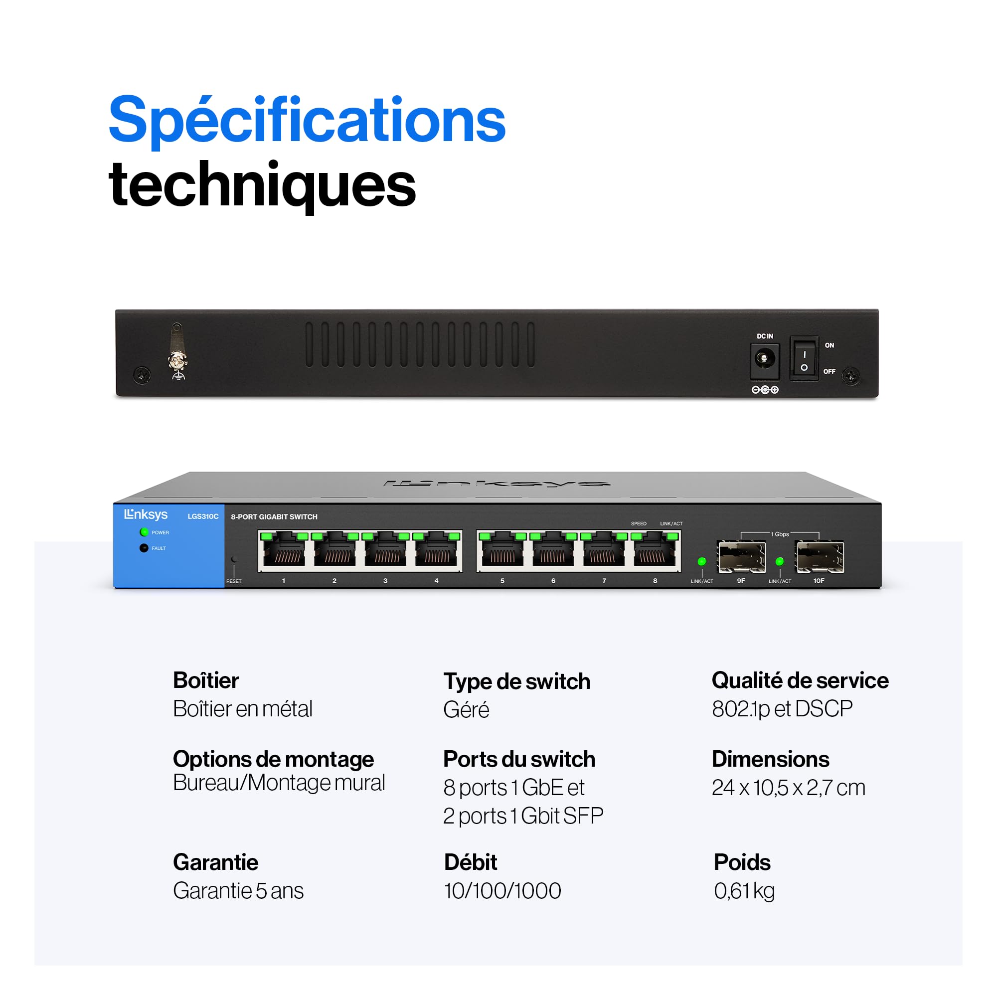 Expand your network capacity with the help of 8 networking ports and transfer your data quickly and easily With leading Layer 2 support, experience enhanced convenience, secure business operations, and a borderless network experience Gigabit Ethernet port for ultra-fast network speeds Effectively reduces downtime with improved network performance À placer n’importe où pour plus de polyvalence. 180W Linksys Switch Manageable 8 Ports Gigabit Ethernet Avec 2 Ports Gigabit Uplink SFP Switch 8 Ports Poe Les quatre autres ports sont compatibles PoE+ pour les besoins d’alimentation standard. Profitez de vitesses de transfert de données ultra rapides grâce à la technologie multi-Gigabit, ce qui en fait la solution idéale pour les applications gourmandes en énergie. Ports : 4 ports PoE++ multi-Gigabit et 4 ports PoE+ multi-Gigabit Étendez votre réseau instantanément grâce au switch PoE+ non manageable polyvalent 8 ports multi-Gigabit 2,5 Gbit/s de Linksys. Vitesses multi-Gigabit : utilisez les ports multi-Gigabit 2,5/1 Gbit/s pour connecter vos appareils sans peine et réduire ainsi le trafic pour les appareils sans fil utilisant le même réseau WiFi. Haute efficacité énergétique : conforme à la norme Energy Efficient Ethernet 802., 3az. Boîtier métallique sans ventilateur : silencieux, durable et facile à installer à la maison ou au bureau. Switch manageable – Trouvez le meilleur prix