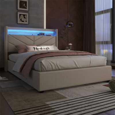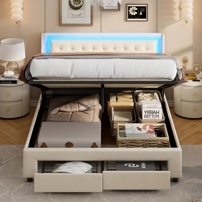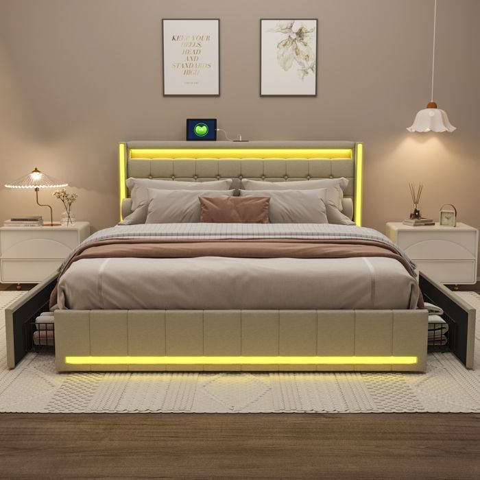 Lit pont 140 x 190 cm avec rangements - avec LEDs - Coloris : Naturel... Livré en deux colis pour un montage facile : Compte tenu de sa taille, ce lit est livré en deux colis. Des instructions claires et des pièces clairement identifiées permettent un montage rapide et facile sans outils supplémentaires. Lit 2 Personnes Lit 140 X 190 Avec Sommier, Lit Double Coffre, Rangement Sous Le Lit, Lit Rembourré En Velours Lit 160x200 Avec Rangement Éclairage LED apaisant : La bande lumineuse LED intégrée à la tête de lit crée une atmosphère relaxante, idéale pour des soirées tranquilles et des nuits romantiques. Comment ne pas succomber au charme de ce lit 140 x 190 cm, si élégant et fonctionnel? Sa teinte neutre, synonyme de pureté, le rend facile à intégrer dans votre chambre à coucher, et vous apprécierez de bénéficier d'un couchage confortable pour 2 personnes dans un cadre chaleureux Un design élégant pour tous les styles : Ce lit double élégant, d'un beige élégant, allie douceur et élégance moderne, idéal pour une chambre au design raffiné. Lit Coffre, Sommier Relevable, 140 X 190 Cm, Avec Rangement, Éclairage LED, Ports De Charge