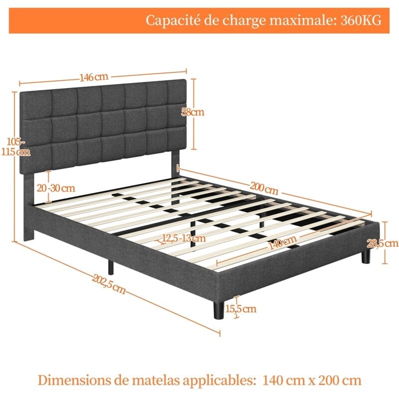 Contenu de l'emballage : 1 lit rembourré., 1 accessoire. 1 notice de montage (français non garanti). Nombre de lattes : 10 Distance entre les lattes : 12 cm - 12,5 cm. Lattes stables : les lattes sont fixées au moyen de fermetures Velcro au lieu de vis. Il s'intègre dans différents styles d'intérieur et crée une atmosphère accueillante. Lit rembourré confortable : la tête de lit rembourrée de ce lit double est remplie de mousse haute densité et offre un confort doux. La housse en lin est douce, respirante et contribue au confort de sommeil. Poids du colis : Colis 1 : 23,8 kg Colis 2 : 8,4 kg Remarques : 1., Les mesures étant prises à la main, les tailles indiquées peuvent varier de ± 1 cm., 2., Le matelas et la parure de lit (couette, drap, oreiller, etc. Taille. 140x200cm ; Matériau. panneaux de bois MDF, contreplaqué, mousse ; Dimensions du produit. 2,08L x 1,47l x 1,04H mètres ; Style. Moderne ; Caractéristique... La distance entre la tête de lit et le cadre de lit est de 21,5 cm. Avertissement De Sûreté Assembler le lit seulement après avoir reçu tous les colis. Description du produit Caractéristiques techniques : Couleur : beige. Lit adulte lit en bois lit double avec tête de lit en cadre de lit avec sommier à lattes-200 x 140 cm bois massif naturel YCDE000187 La tête de lit haute et rembourrée vous permet de vous appuyer confortablement pendant que vous regardez la télévision ou lisez. Description: Avec ce lit douillet, vous pouvez profiter de vos heures de sommeil dans une détente optimale et un confort agréable : ce lit capitonné dispose d'une tête de lit haute touffetée avec un design en forme d'ailes, de lattes en bois solides, d'un cadre en métal solide et de pieds robustes. Grâce aux composants rembourrés, le lit est silencieux et ne roule pas. Ainsi, le lit est silencieux et offre une nuit de sommeil paisible et confortable. Il donne à la chambre une atmosphère élégante et accueillante. YAHEETECH Lit Double Rembourré 140 X 200 Cm Avec Sommier, Pour Adultes En Bois Massif Et Métal, Gris Foncé · Tête de lit confortable · Sommeil réparateur · Espace... Lit Rembourré 140x200 Lit 140 X 200 Cm, USB, Lit Adulte Rembourré, Avec Tête De Lit, Sans Lit Design Moderne En outre, ce lit en tissu ne passera pas inaperçu grâce à son design sobre. La tête de lit haute permet l'utilisation de matelas de différentes épaisseurs. ) ne sont pas inclus., 3., Ce canapé-lit est livré en 2 colis.