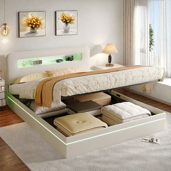 Ne vous inquiétez pas si tous les colis n’arrivent pas en même temps. Lit 160x200 Avec Sommier Lit Capitonné 160 X 200 Cm Avec LED RGB Et Rangement Hydraulique, Lit Simple Avec Ports USB/Type-C - Tête De Lit Rembourrée,beige (sans Matelas) | Leroy Merlin Lit Coffre 140x200 Son tissu doux et luxueux crée une atmosphère chaleureuse, tandis que la tête de lit avec LED intégrée ajoute une touche de sophistication. Lit double avec espace de rangement LED - L'éclairage LED avec télécommande offre des couleurs et des luminosités personnalisables, idéal pour une atmosphère détendue dans la chambre Rangement Pratique avec Mécanisme Hydraulique – Le lit dispose d'un système de rangement sous le matelas avec un mécanisme hydraulique. Il permet de ranger facilement des couvertures et des vêtements, optimisant ainsi l'espace de votre chambre. Canapé-lit rembourrée 90 x 190 cm avec fonction de chargement USB Type... Éclairage LED Ambiant – Une bande LED est installée autour du pied de lit et du tête de lit, apportant une lumière douce et chaleureuse, idéale pour créer une atmosphère relaxante et romantique. Le système hydraulique permet d'exploiter l'espace sous le matelas pour ranger des couvertures, des oreillers et d'autres articles, offrant ainsi un gain de place optimal. Velours de Haute Qualité – Le revêtement en velours de haute qualité du tête de lit et des côtés du lit offre une sensation de confort et de luxe tout en étant durable et facile à entretenir. Deducir Kilómetros corte largo respaldo de cama con luz led desarrollo de flotad Spécifications du produit : Dimensions : Longueur : 221,5 cm Largeur : 147 cm (pour un matelas 140x200 cm) Hauteur du cadre : 30 cm Hauteur totale : 95,5 cm Hauteur de la tête de lit : 145 mm Poids maximal supporté : 300 kg Matériaux : Tissu : Velours Beige Mécanisme hydraulique : Pour un accès facile au rangement sous le lit Éclairage : LED RGB : Éclairage réglable en couleur et intensité, avec une télécommande pour personnaliser l'ambiance de la chambre Ports USB : Intégrés dans la tête de lit pour la recharge facile des appareils électroniques Livraison en Plusieurs Colis : En raison de la taille du produit, celui-ci sera livré en 2 colis séparés.