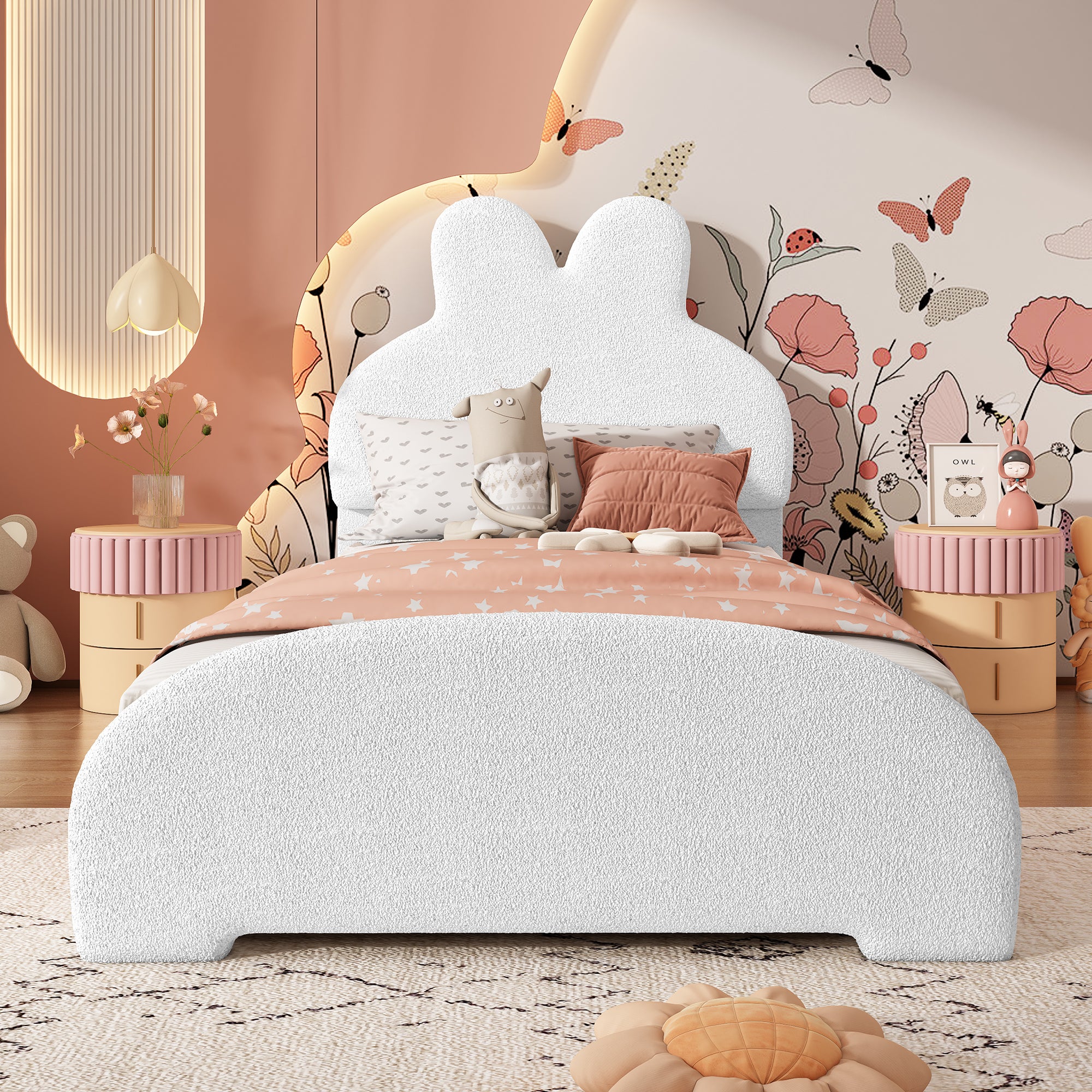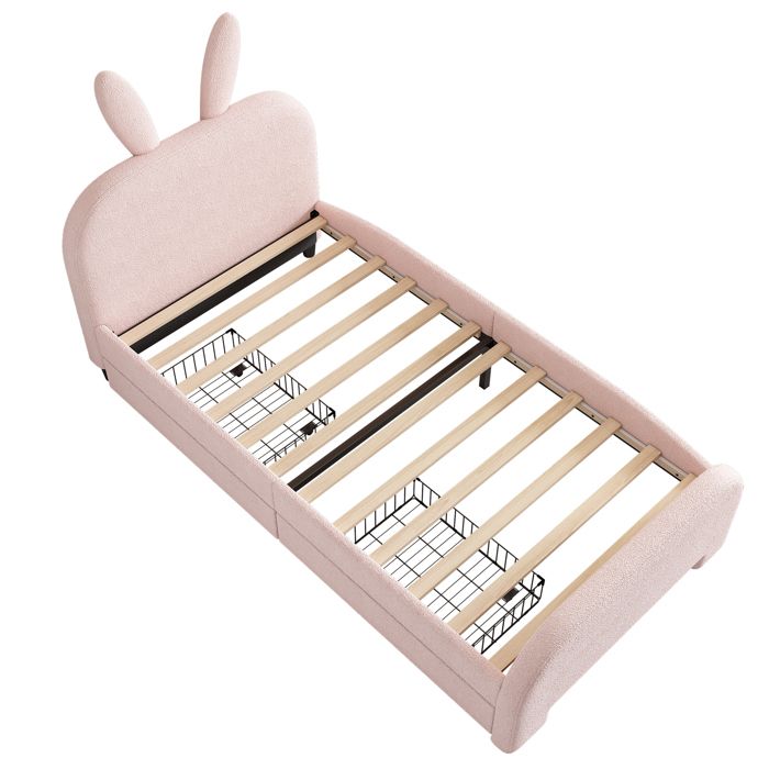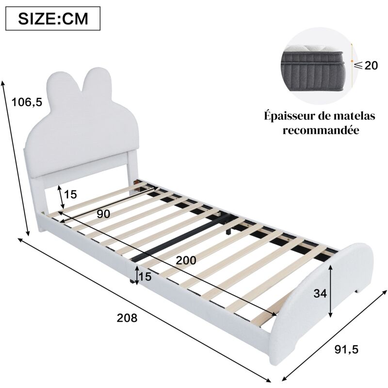 Lit Cabane Pour Enfant 90x200cm, Lit Simple Avec Barrière, En Bois OOIILLEE Lit Lapin Lit Enfant 90x200 Cm, Lit Simple, Tête De Lit En Forme De L'oreille Lit Bébé 90x200 Conforama Principaux points forts · Taille. Lange Hasenohrenform · Matériau. Simili cuir · Dimensions du produit. 2,08L x 0,92l x 1,34H mètres · Style. Caricature Le revêtement blanc en simili-polaire offre un toucher doux et agréable et souligne son look charmant. Lit simple pour enfant avec rangement Lollin 90x190cm Bois foncé et... Un lit idéal pour les enfants qui aiment le confort et les designs fantaisistes., Points de vente : 1., Blanc simple 2., Sommier à lattes stable 3., Tête de lit en forme de cheminée 4., Design antidérapant sur la face inférieure du lit 5., Imitation polaire douillette 6., Convient à différents styles de chambres d'enfants Poids et dimensions Dimensions totales : 208 x 91,5 x 106,5 cm Poids total : 21 kg Matelas adaptés (matelas non inclus) : 90 x 200 cm (épaisseur du matelas ≤ 20 cm) Capacité de charge : lit : 150 kg Caractéristiques Nom du produit : lit rembourré Couleur : blanc Tissu : imitation polaire Matériau des lattes : contreplaqué Méthode d'assemblage : à installer soi-même Certificat FSC : oui Numéro de colis : 1 Pays d'origine : Chine Le design antidérapant sur la face inférieure empêche le lit de glisser sur les sols lisses et offre une sécurité supplémentaire au quotidien.