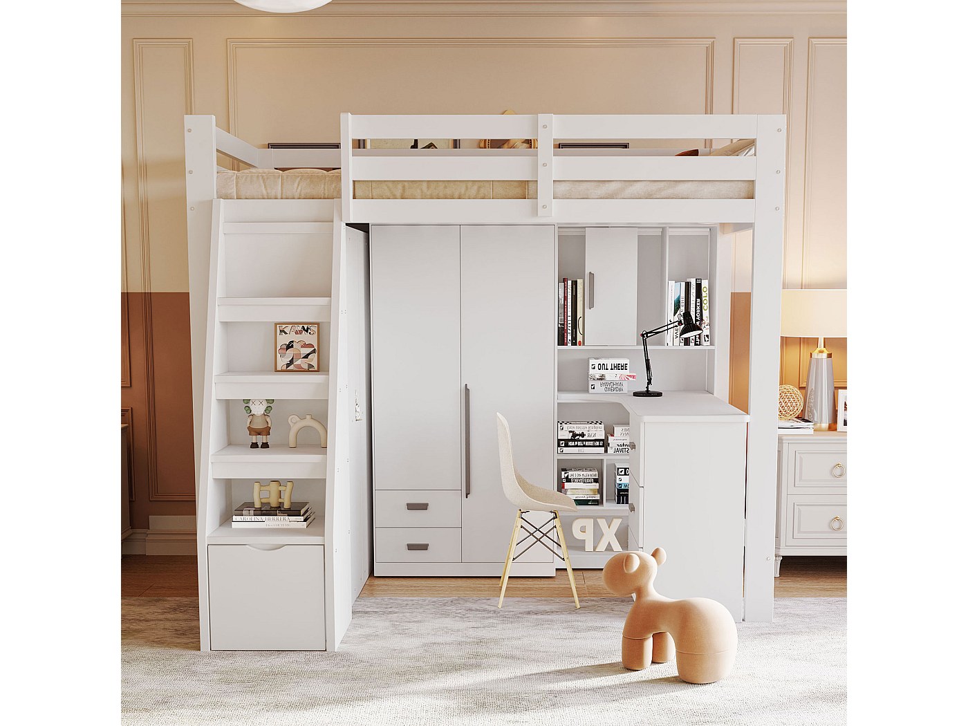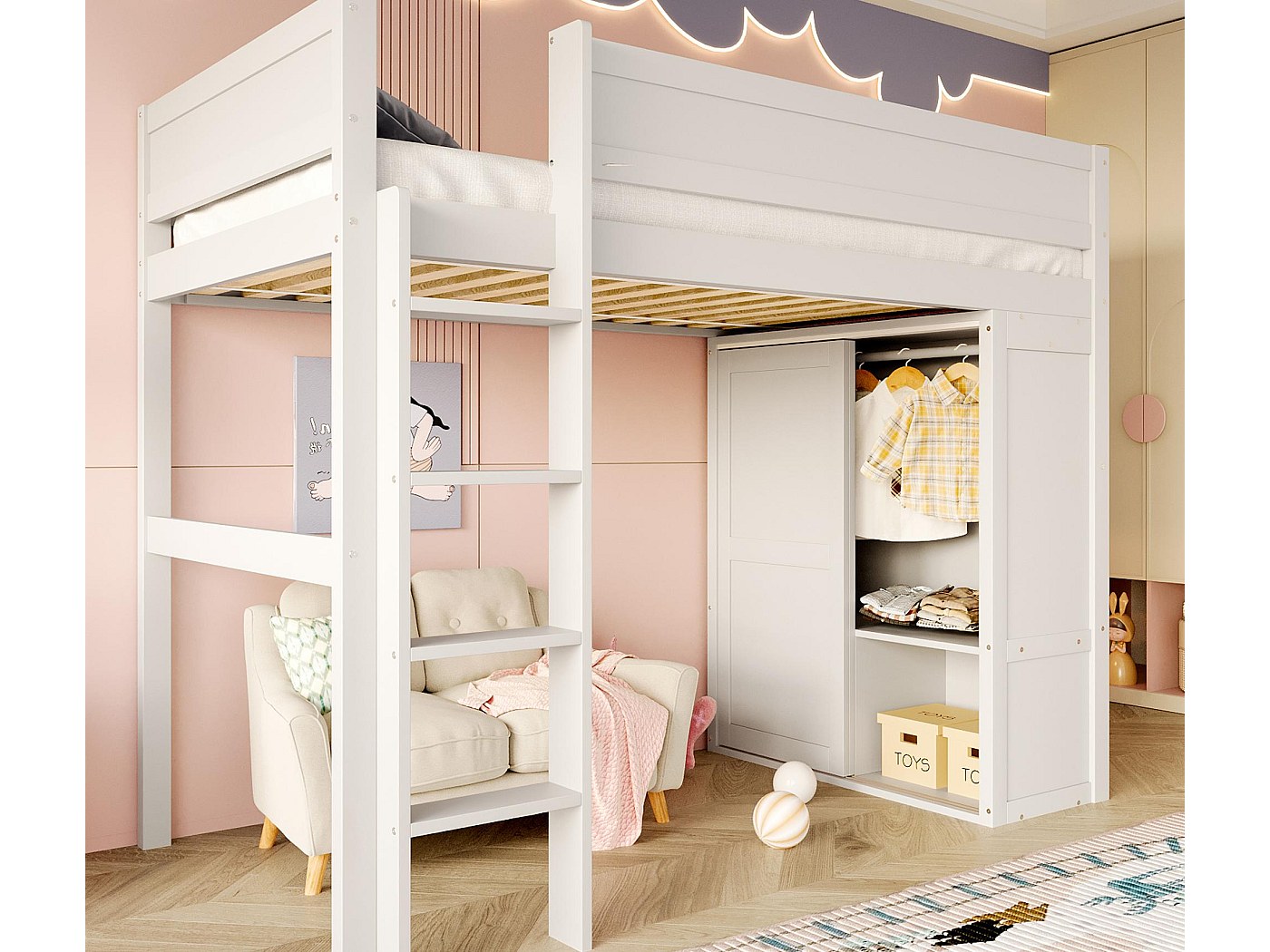 Lit mezzanine 90x200 cm avec échelle, cadre en métal et étagère de Lit cabane superposé 90x200 sommier inclus Gaëlle Bois Mezzanine Bureau Jeu Rangements 3 En 1 Lit Mezzanine 90 X 200 Cm, Lit Enfant Avec Penderie Et Rangements, échelle De Sécurité Lit Superposé Séparable Enfant Lit Mezzanine Évolutif 90x200 cm - Gain de Place Maxi avec Placard Intégré & Escalier Sécurisé Espace de Rêve + Bureau/Jeu = Solution 3-en-1 pour Chambres Compactes Ce lit mezzanine haut de gamme (90x200 cm) révolutionne l'aménagement des petites chambres : il combine un couchage surélevé sécurisé avec un espace inférieur modulable et des rangements intelligents. utilisateur 120 kg Matériaux: Pin massif + Métal renforcé + Contreplaqué + MDF Épaisseur matelas: 8-12 cm (recommandé) Nombre de lattes 12 (espacement 6 cm) Couleurs disponibles Blanc laqué / Finition bois naturel Contenu : 4 colis (93 kg total) Toutes pièces + outils fournis Notice illustrée pas-à-pas Lit mezzanine enfant en bois 140×200cm, échelle de rangement, lit... 220 cm requis) Poids max. Placard intégré ultra-fonctionnel - Compartiment de rangement encastré sous le lit pour vêtements et affaires personnelles - organisation optimale sans mobilier supplémentaire. Espace modulable créatif Transformez la zone sous le lit selon vos besoins : Coin étude avec bureau, Univers jeu pour enfants, Petit salon lecture. Escalier sécurisé 3-en-1 - Tiroirs coulissants sous chaque marche (jouets/livres);Structure antidérapante + rampe ergonomique;Espace de rangement additionnel XXL.