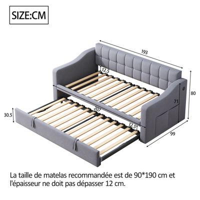 Ce canapé-lit rembourré est doté d'un sommier à lattes robuste et sa construction solide assure stabilité et résistance, avec une capacité de charge allant jusqu'à 300 kg. Canapé-lit extensible Pugsdrly 90/180*190 cm, avec rayures verticales, avec sommier à lattes, lit multifonctionnel, tissu en lin confortable et respirant, gris... Nombre de colis : 2 Poids total du produit : 52 kg Capacité de charge : 300 kg Épaisseur de matelas recommandée : 14-16 cm Épaisseur de matelas recommandée pour lit escamotable : 8-12 cm Caractéristiques : Type de produit : Lit rembourré Dimensions : 90 x 190 cm Couleur : Beige/Gris/Gris clair Matériau : Lin + Métal + Contreplaqué + MDF Niveau d’assemblage : Assemblage complet requis/Assemblage partiel Poids total du colis : 58 kg Nombre de lattes : 24 Temps de montage estimé : 1 heure Nombre de personnes recommandé : 2 Outils supplémentaires requis : Tous les outils sont inclus/Tournevis Outils électriques non fournis : Oui Sa flexibilité offre un espace généreux pour se détendre ou dormir. Canapé Lit Convertible 90 180x190 Vepssder Canapé Lit Rembourré Multifonctionnel 90/180×190 Canapé Convertible 3 Places Poids et dimensions : Dimensions totales du produit : 200,5 x 96 x 86 cm Dimensions détaillées du produit : Veuillez vous référer à l'image des dimensions. Avec son look classique et minimaliste, ce canapé-lit rembourré extensible s'intègre parfaitement dans de nombreux salons, chambres d'amis ou chambres à coucher, ce qui en fait le choix idéal pour ceux qui apprécient la fonctionnalité et l'esthétique. Le tissu en lin confortable et respirant rend ce canapé-lit facile d'entretien et résistant, idéal pour un usage quotidien. Grâce à sa structure hydraulique unique, il est disponible en deux tailles : 90 x 190 cm et 180 x 190 cm. Idéal pour les salons, les chambres d'amis ou les petits appartements, il offre une solution élégante et pratique pour un style de vie moderne. Sa particularité réside dans sa rallonge extra-longue, qui permet de le transformer en deux tailles différentes : 90 x 190 cm et 180 x 190 cm. Les rayures verticales du revêtement confèrent au canapé une touche moderne et élégante, rehaussant son esthétique et en faisant le point central de toute pièce. C lit rmbourré d haut qualité st doté d'accoudoirs gauch t droit, d'un dossir, d'un sommir à latts t d'un systèm sans sommir. Ls accoudoirs latéraux sont rivtés, t l compartimnt d rangmnt multifonctionnl st équipé d lumièrs LD t d ports USB pour répondr aux différnts bsoins ds clints Conçu avec une attention particulière aux détails, ce lit multifonctionnel est confectionné en lin respirant de haute qualité et offre un confort optimal. Montage facile : le lit mesure 200,5 x 96 x 82 cm avec sommier à lattes (matelas non inclus). Canapé-lit Rembourré - 90/180 X 190 Cm - Aveca Ccoudoirs Bluetooth Usb Avec Rangement Tissu Velours Gris