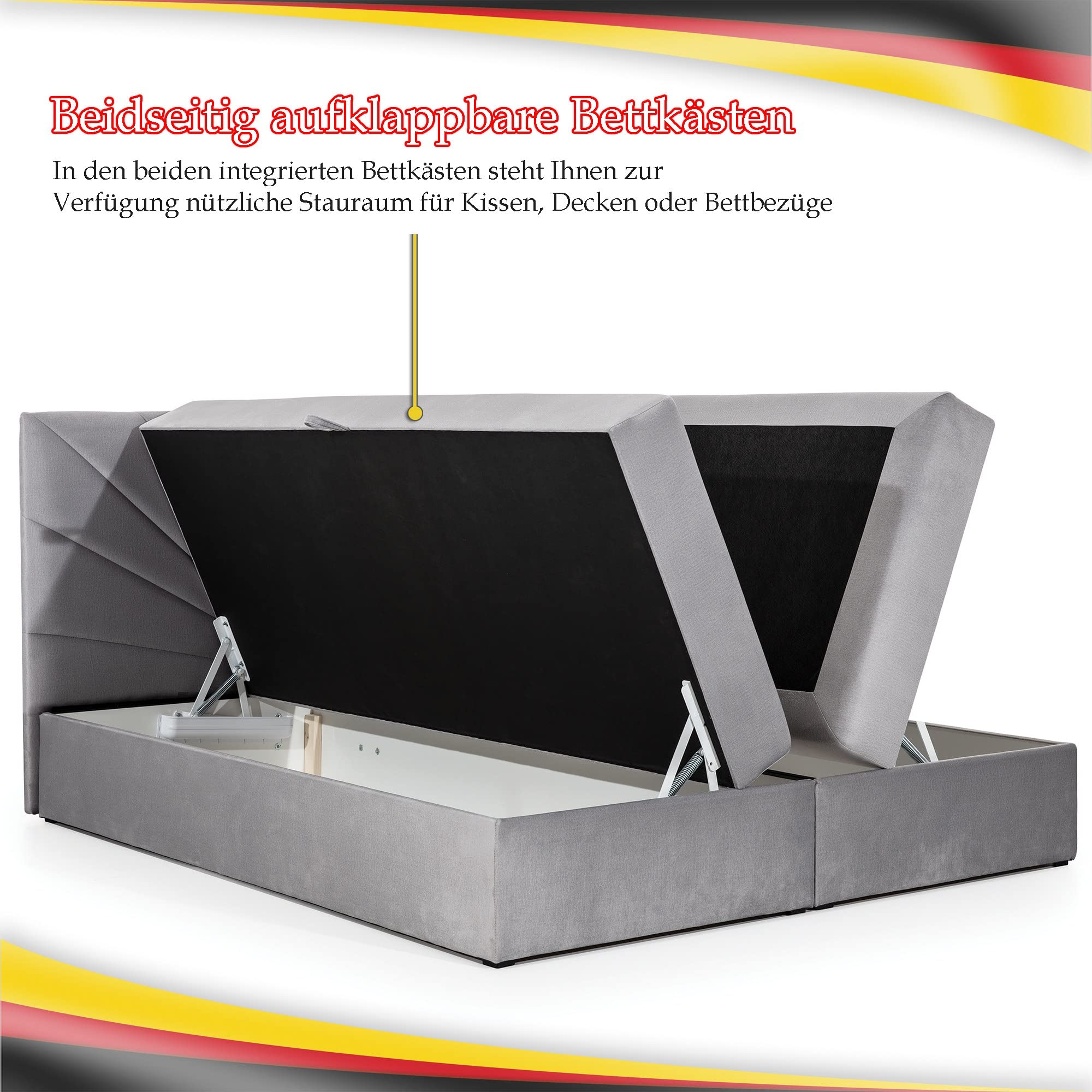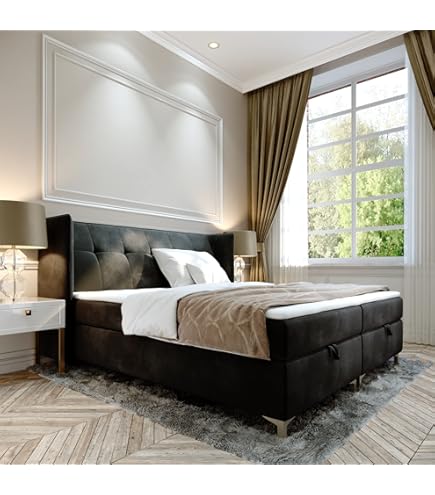Lit double Monako. Le dos est recouvert d'un tissu élastique. Le lit est recouvert de tissu Elisa Velvet. Lit Tête De Lit Rembourrée Lit à Sommier Tapissier MONAKO - Lit Double Avec Matelas Bonell, Avec Coffre Pour Linge De Lit Et Sur-matelas - Tête De Lit Rembourrée Et Pied Décorées D'une élégante Couette (bleu Foncé Lit Velours élégant 160x200 Chaque lit est rembourré par le rembourrage lui-même. Charge maximale : environ 150 kg par couchage. Hauteur du pied de lit : 68 cm. Tête de lit et pied rembourrés ornés de surpiqûres élégantes et de nombreux strass Longueur du produit: 215 cm Zepneiy Lit 140 x 190 Sommier Étagère Cachée Capitonné Coffre Rangement Double 2 Personnes Hauteur de la surface de couchage : 51 cm avec surmatelas / 46 cm sans surmatelas. Le surmatelas est inclus dans le prix - Mousse hautement élastique de 5 cm Livraison : Livraison gratuite en Allemagne. Le lit n'est pas autoportant. Lit à sommier tapissier en bouclé (bonell, surmatelas, double tête de... La tête de lit et le pied de lit sont ornés d'une élégante surpiqûre et de nombreux strass. 160 x 200 cm - Largeur : 162 cm - Surface de couchage : 160 x 200 cm Le surmatelas se trouve dans le tiroir de lit. Les meubles sont livrés par une compagnie de transport spécialisée. Un surmatelas confortable en mousse froide de 5 cm d'épaisseur épouse parfaitement le dos et soulage la colonne vertébrale. Les dimensions peuvent varier légèrement de celles indiquées dans la vente aux enchères. Nous n'offrons pas de modifications aux dimensions des meubles. Dimensions : 120 x 200 cm - Largeur : 122 cm - Surface de couchage : 120 x 200 cm Grâce aux deux tiroirs de lit intégrés, vous disposez d'un énorme espace de rangement. L'article est livré démonté (3 pièces), une notice de montage est incluse. Le lit a un matelas à ressorts Bonnell (150 kg de charge par côté du lit, hauteur 19 cm) qui assure un confort de sommeil optimal. Lit à sommier tapissier au design élégant. 180 x 200 cm - Largeur : 182 cm - Surface de couchage : 180 x 200 cm Tissu (housse) : Velours fin « Elisa Velvet » Composition : 100 % polyester, grammage : 300 g/m² +/-5 % ; Résistance à l'abrasion : 90 000, ne bouloche pas, ce qui prouve le boulochage de 4 à 5 points. Tissu velours résistant et agréable au toucher Le lit tapissier peut également être équipé d'un sommier intégré, à lattes ou à ressorts, garantissant un excellent soutien pour votre matelas. Et pour encore plus de praticité, certains modèles intègrent des rangements discrets, sous forme de tiroirs ou de coffres, pour optimiser l'espace sans sacrifier le style