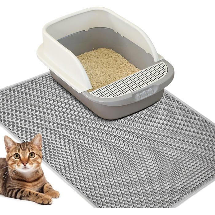 Tapis de litière imperméable à double couche pour chat Résistant à l'urine et sûr : La couche inférieure imperméable du tapis de litière protège vos sols des taches indésirables et empêche toute fuite de liquide Tapis Double Couche Eva Imperméable 60x90 Grand Tapis De Litière Pour Chat : 90X60 Cm Double Eva Tapis De Litière Pour Chat Design Nid D'Abeille Imperméable Tapis De Litièr Couche Pour Chat MATÉRIAU DE HAUTE QUALITÉ : notre tapis de litière pour chat est fabriqué en matériau EVA sûr, exempt de BPA et de phtalates. Design unique, propreté sans souci : la structure en nid d'abeille à double couche du tapis de litière pour chat recueille efficacement la litière pour chat. Taille XL (60 × 90 cm) : ce tapis de litière pour chat couvre toute la zone devant la litière, ce qui le rend idéal pour les grands chats ou les foyers multi... Il est doux et sûr, protège les pattes de chat, est résistant à l'abrasion et particulièrement durable. Nettoyage facile : la conception à double couche permet d'ouvrir facilement le tapis et de vider rapidement la litière, de l'aspirer ou de la rincer à l'eau pour un maximum de propreté avec un minimum d'effort. Une fois posés, il suffit de les lester avec un objet lourd pendant 24 heures pour les remettre à plat. La couche inférieure protège le sol de l'humidité et de l'humidité.