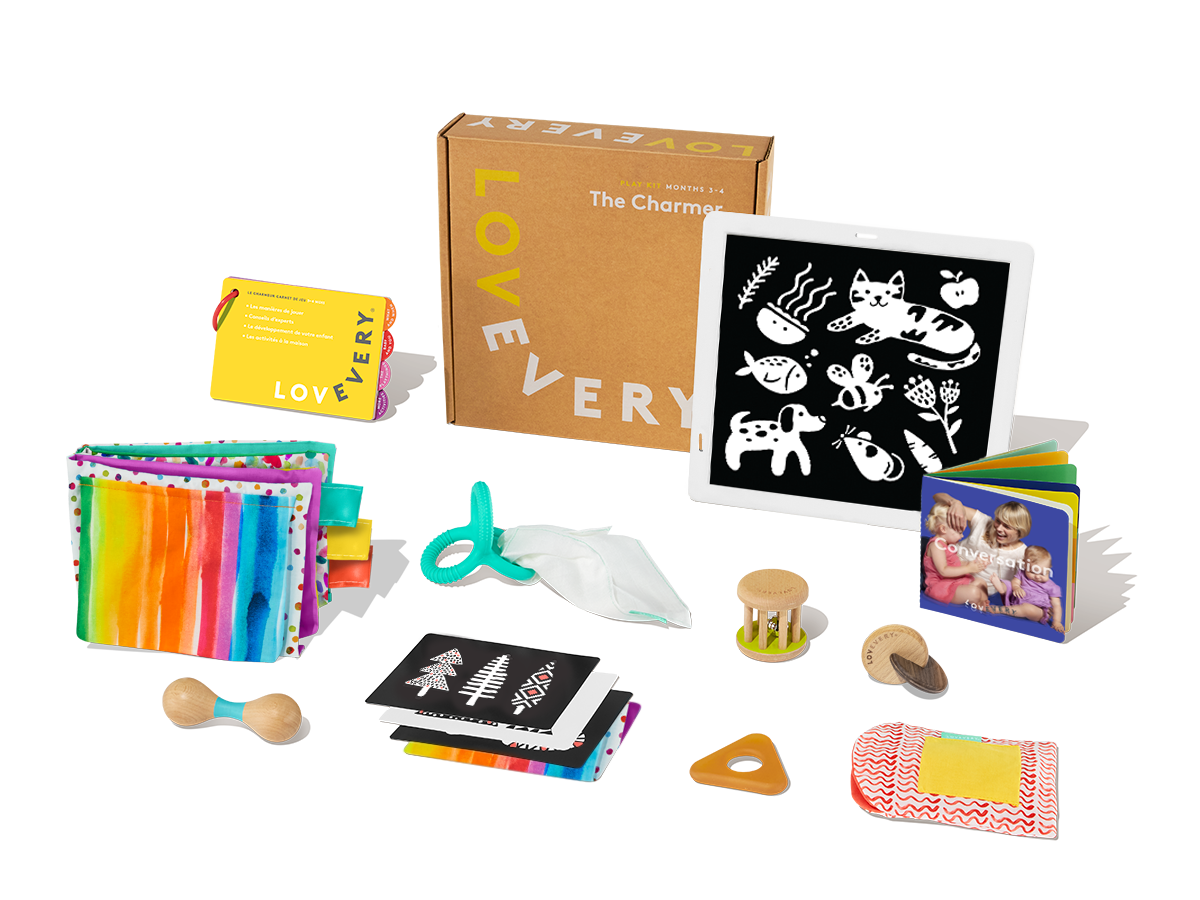 Le kit Le Charmeur est la box de jouets pour bébé de 3 à 4 mois. Avec le livre sensoriel qui invite au toucher ou le Hochet Grelot pour l'observation et l... Apprendre par le jeu : le kit de jeu Charmer encourage la conscience sociale et la pratique en utilisant les deux côtés du cerveau Ce qui est inclus : le kit de jeu Charmer comprend un hochet en bois, un anneau de dentition triple en silicone et un chiffon de dentition organique, une clochette roulante, un livre souple, une carte miroir, un livre noir et blanc, un livre parlant, un sac froissé, un anneau de dentition triangulaire en caoutchouc, des disques mains à main, un miroir encadré et un guide de jeu de 3 à 4 mois Cadeau Nouveau-né LOVEVERY, Kit De Jeu Explorer + Livre Bonus, Jouets De Développement Pour Bébé Et Cadeau, Essentiels Pour Nouveau-né, Y Compris Les Jouets Montessori Kit Charmer Temps Sur Le Ventre Livre bonus : « Life Around Me » : découvrez les images, les sons et les mouvements de la vie quotidienne. Kit de jeu Lovevery Le Charmeur / The Charmer 3-4 mois Kit en français et complet. Le miroir est neuf sous blister ce qui est rare dans un kit d’occasion. Quelques griffures sur les cartes et pleins de micro rayures sur le petit miroir Le meilleur cadeau pour bébé de 3 à 4 ans et plus : votre bébé peut commencer à reconnaître votre visage : rouiller vers vous, souriant et ravissant tous ceux qu'il rencontre. Lovevery the Charmer Play Kit for 3-4 Months
