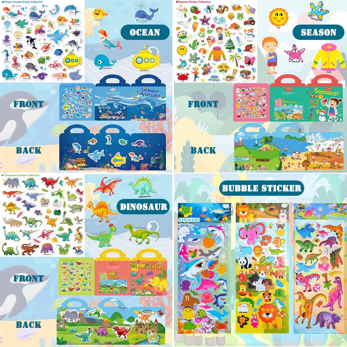 D-FantiX 4 Pack Reusable Sticker Books for 2 3 4 Year Old Ces scènes immersives favorisent la coordination œil-main, la narration d'histoires et l'indépendance sereine tout en réduisant le temps passé devant les écrans. Cadeau Fille 2 Ans Lot De 4 Livres D'autocollants Réutilisables,Jouets Pour Autocollants 3D Enfants 2-4 Ans Faciles à décoller : fabriqués à partir d'un matériau ultra-doux et sans danger pour la peau, nos autocollants 3D présentent des textures tactiles en relief. Coffret d'activités avec autocollants gonflés : découvrez le plaisir infini des autocollants ! Plongez dans les thèmes de la mode, des princesses, des sirènes et des animaux de compagnie avec ce coffret d'autocollants réutilisables à prix très avantageux Offrez à vos enfants un monde d'activités créatives et amusantes avec ce lot de 4 livres d'autocollants réutilisables. Les thèmes des dinosaures, des animaux, de la mer et des insectes stimuleront leur imagination et leur créativité Chaque scène colorée offre des heures de jeu créatif. Parfait pour la maison ou les salles de classe. Idéal comme cadeau d'anniversaire, récompense en classe ou compagnon de voyage. Coffret d'activités avec autocollants gonflés : 4 thèmes passionnants (ferme, dinosaures, océan et safari) avec plus de 120 autocollants gonflés imperméables (plus de 40 par livre !, ). Parfaits pour les avions, les trains, les voyages en voiture, les restaurants ou le camping. D-FantiX Livre d'autocollants gonflés pour enfants, livres d'autocollants 3D réutilisables pour tout-petits, comprend fermes, dinosaures, océan, safari, plus de 120 autocollants réutilisables, 8 scènes pliantes