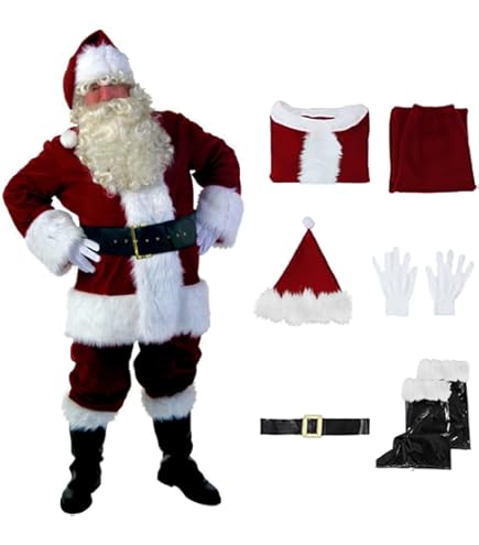 Déguisement Père Noël ÉCO, adulte 9PC : 1 haut 1 pantalon 1 couvre-bottes 1 chapeau 1 paire de gants 1 fausse barbe 1 ceinture 1 clochette 1 paire de lunettes · Facile à porter Ensemble Fête Noël Cosplay Costume Et Déguisement En Location De Père Noël à Donnezac En Haute Gironde Ensemble Père Noël Fête Noël Costume de Père Noël : Costume Pere Noel Ensemble,Déguisement père noël Adulte, Pantalon à Bande élastique, Costume de Père Noël Universel de Grande Taille, Ensemble de fête de Noël, Cosplay, 9PC 9pc: 1pc chapeau + 1pc haut + 1pc pantalon + 1pc ceinture + 1pc ourlet Hood Le pantalon est livré avec un cordon de serrage allongé afin que vous puissiez l'ajuster à votre tour de taille. Matériaux Premium: les costumes du père Noël sont faits de 100% velour. Taille: taille M,L,XL,XXL,XXXL. (voir le tableau des tailles et choisir la... Facile à porter :Le costume du pere noel peut être porté directement sur les vêtements et est facile à mettre et à enlever. Recommandations de lavage : Nettoyage à sec Portez-le pour célébrer les vacances de Noël et ajoutez à l'esprit de Noël pour divertir vos enfants. Costume de Père Noël : le costume de Père Noël est fabriqué en tissu non tissé.