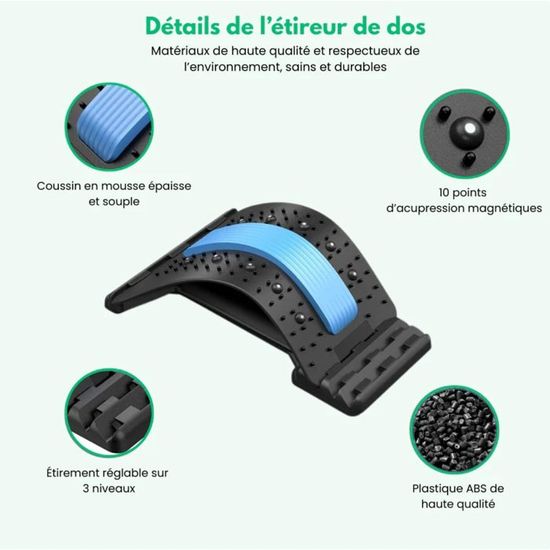 SURENHAP orthèse de soutien lombaire Ceinture de soutien lombaire, de Bustier-corset,Planche lombaire BBL, planche de liposuccion lombaire... Appareil Massage Dos Antidérapant Planche De Soutien Lombaire Réglable à 4 Niveaux, Etireur Lombaire Ergonomique Avec Massage Magnetique Points Dacupression Pour Soulagement Decompression Vertebrale L 92030771 Étireur Lombaire Utilisable à domicile, il enrichit les routines de fitness tout en garantissant stabilité et confort, même sur un lit. En raison de différentes mesures manuelles, veuillez permettre une différence de taille de 1 à 2 cm. Étireur dorsal pour soulager les douleurs dorsales, planche multi-niveaux pour le dos, support lombaire et supérieur pour les hernies ; Longueur · 40 cm... Poids net: 400gMatériel: Silicone + AbsTaille: 38 x 20 x 4cm / 14,96 x 7,87 x 1,57 poucesNote:En raison de différents paramètres d'éclairage et d'écran, la couleur de l'élément peut être légèrement différente de l'image. Réglages de hauteur personnalisables : Dispose de trois niveaux réglables pour s'adapter à plusieurs utilisateurs, autorisant une modification aisée de la position afin de correspondre efficacement aux besoins et préférences d'étirement du dos Stabilité optimale : Offre une résistance exceptionnelle grâce à sa capacité de portance élevée et son utilisation stable, garantissant une valeur durable dans votre routine de bien-être et de confort dorsal Outil Ergonomique : Pensé pour des utilisateurs polyvalents, le stretch dos simplifie les étirements guidés avec sa configuration facile et sa fonctionnalité anatomique, offrant un soutien dorsal optimal et personnalisable